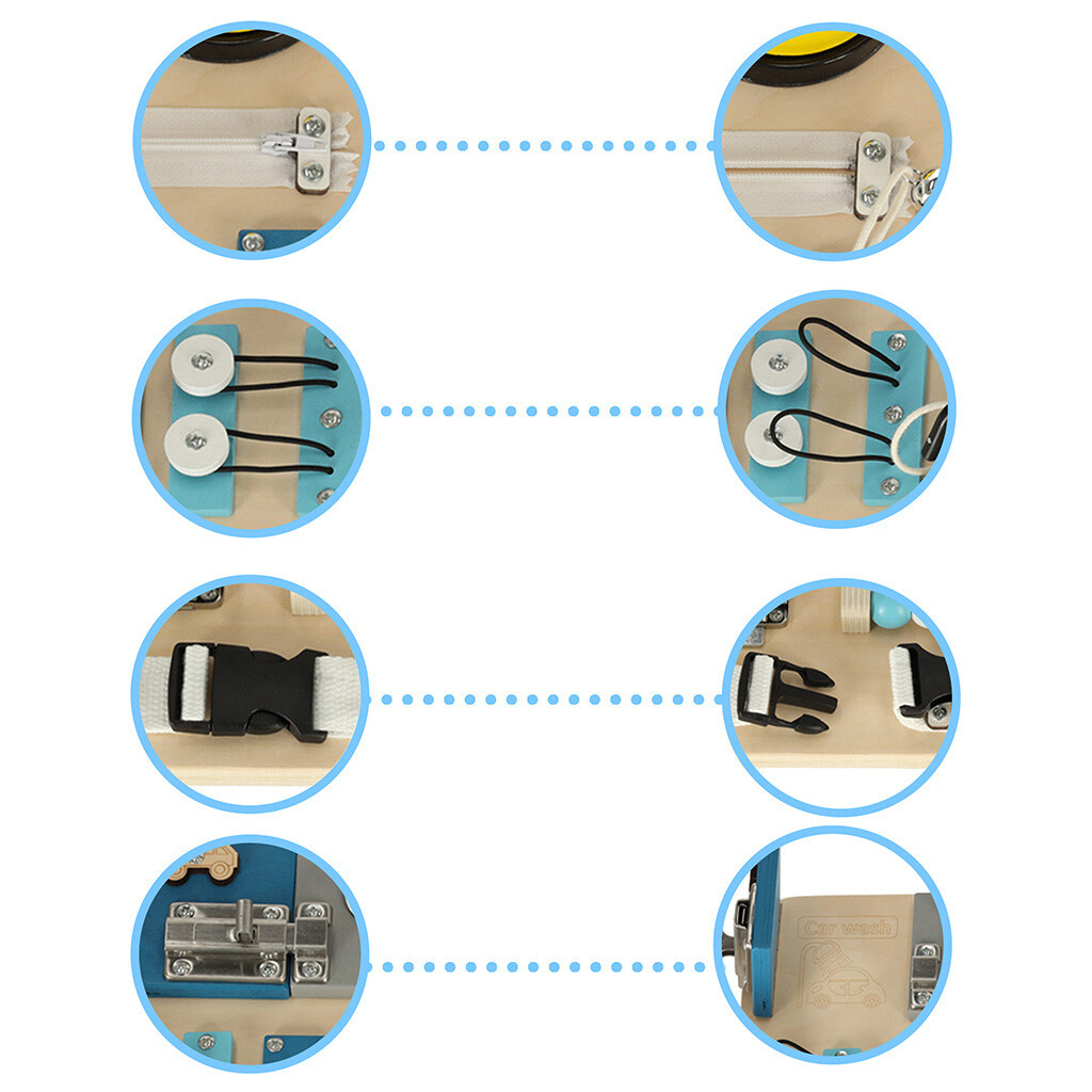 Nabízená deska je ve tvaru autobusu, který jistě upoutá pozornost každého malého fanouška vozidel. Mnoho prvků odkazuje i na automobilový průmysl - dřevěná auta a nákresy myčky a čerpací stanice.