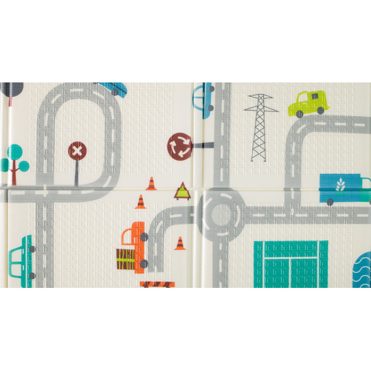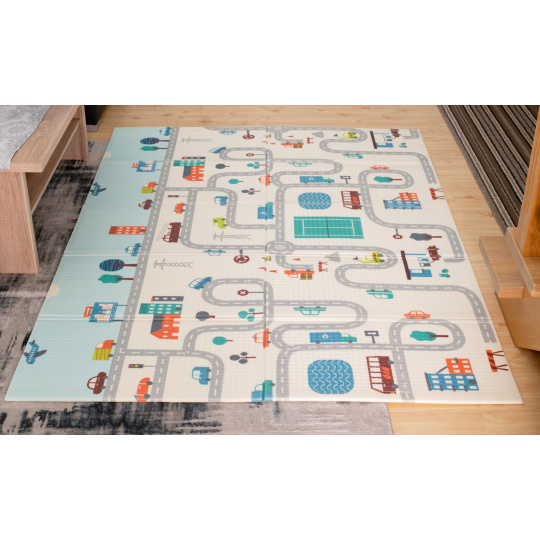 Velká, oboustranná pěnová hrací podložka s pouličním a lesním vzorem.