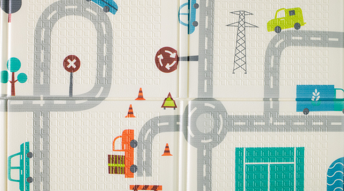 Velká, oboustranná pěnová hrací podložka s pouličním a lesním vzorem.