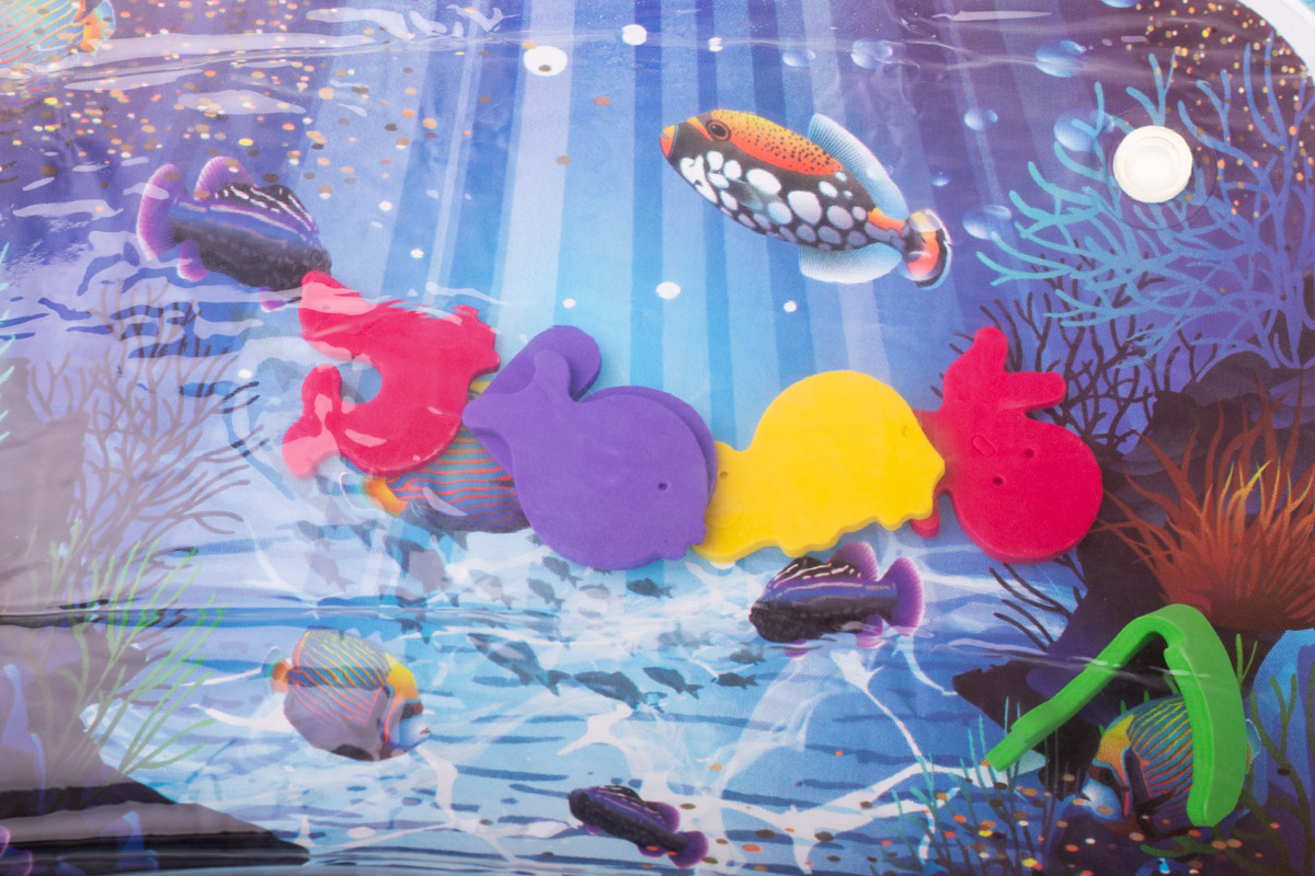 Uvnitř podložky jsou barevná vodní zvířátka, která se budou pohybovat pod vlivem pohybů dítěte.