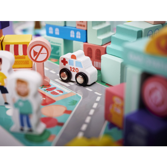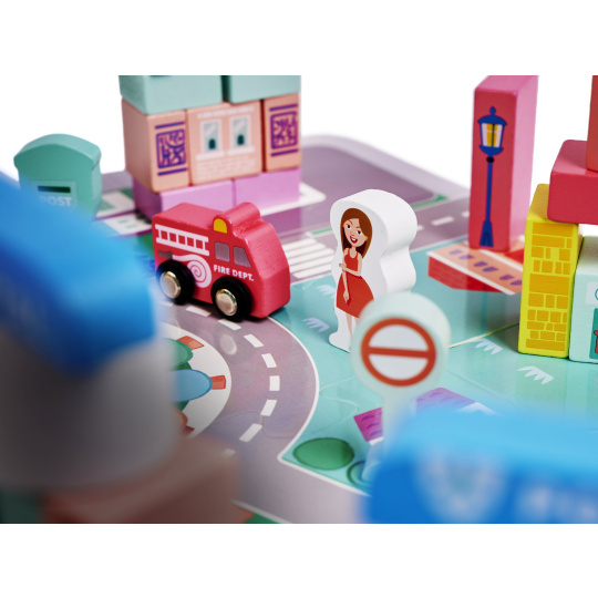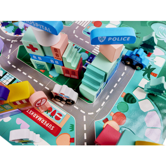 Ve městě nemůže chybět to nejdůležitější - ulice a auta . Sada obsahuje puzzle, které po sestavení vytvoří desku s pruhem ulic. Budou dokonalým doplňkem celku.