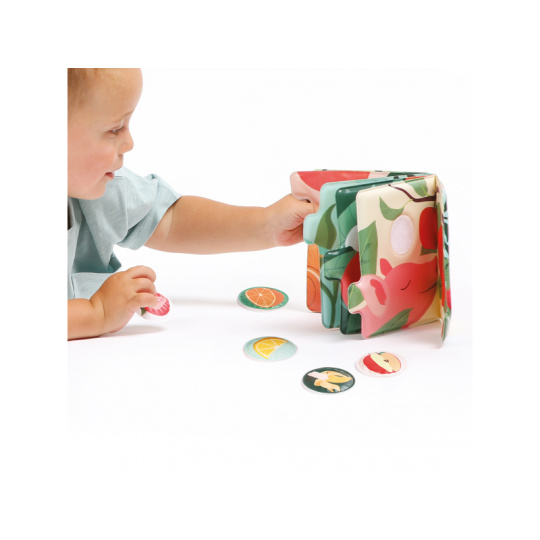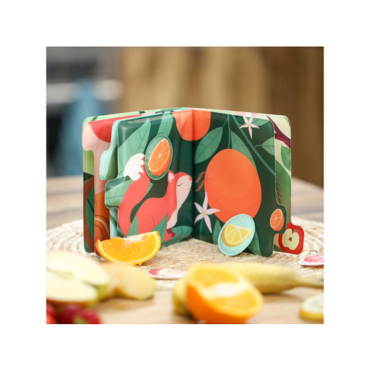 Vůně, barvy a první slova v jedné knížce! Tato interaktivní smyslová kniha s vůní ovoce vtáhne děti do světa chutí a přírody prostřednictvím veselých zvířátek a jejich oblíbeného ovoce. Každá stránka nabízí nová překvapení a probouzí zvídavost i fantazii. Knížka, která zapojí všechny smysly: Barevné ilustrace doplňuje jemná vůně ovoce, která se uvolní po přejetí prstem Děti se hravou formou učí poznávat ovoce, barvy, zvířátka i nová slova Interaktivní čtení podporuje slovní zásobu i smyslové vnímání Hra na přiřazování: Součástí knihy je 5 voňavých samolepek (broskev, pomeranč, jahoda, jablko, hroznové víno), které děti připevňují pomocí suchého zipu na správné místo Skvělá aktivita pro rozvoj čichové paměti, logického myšlení i jemné motoriky Silné stránky a snadno uchopitelné části umožňují i nejmenším čtenářům aktivně objevovat svět kolem sebe. Rozměry knihy: 15 × 15 × 3,5 cm Průměr voňavé samolepky: 5 cm Složení: 100 % PEVA Údržba: otírat vlhkým hadříkem Vhodné pro děti od 12 měsíců