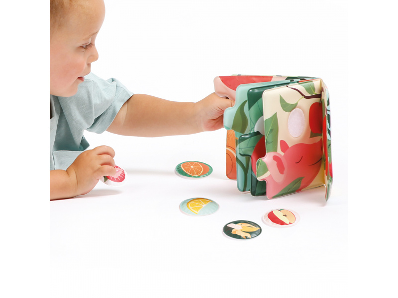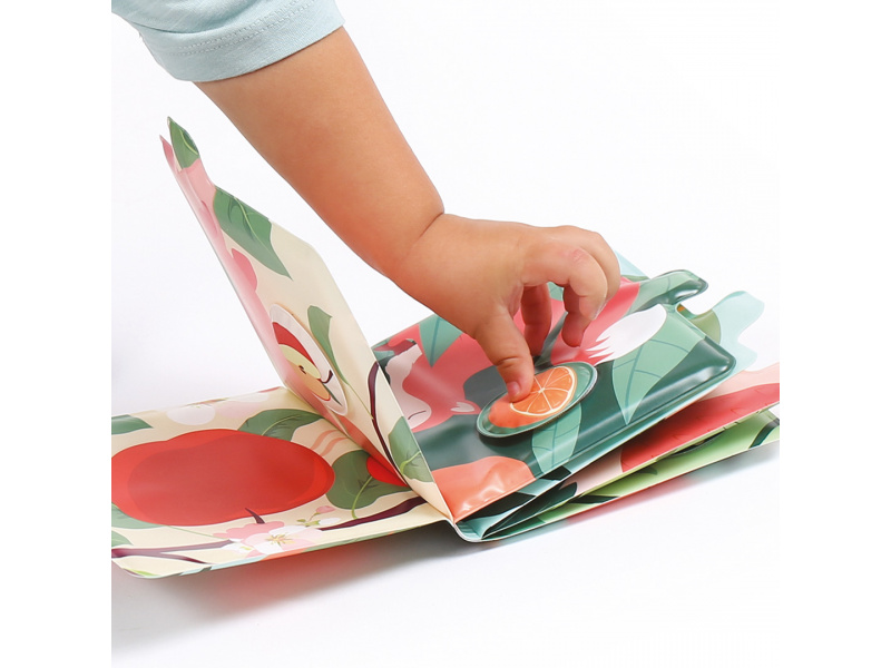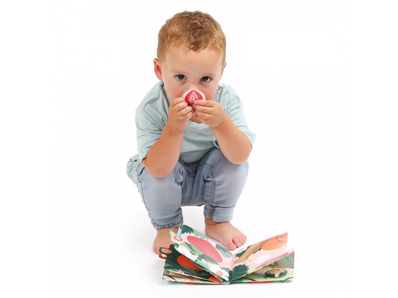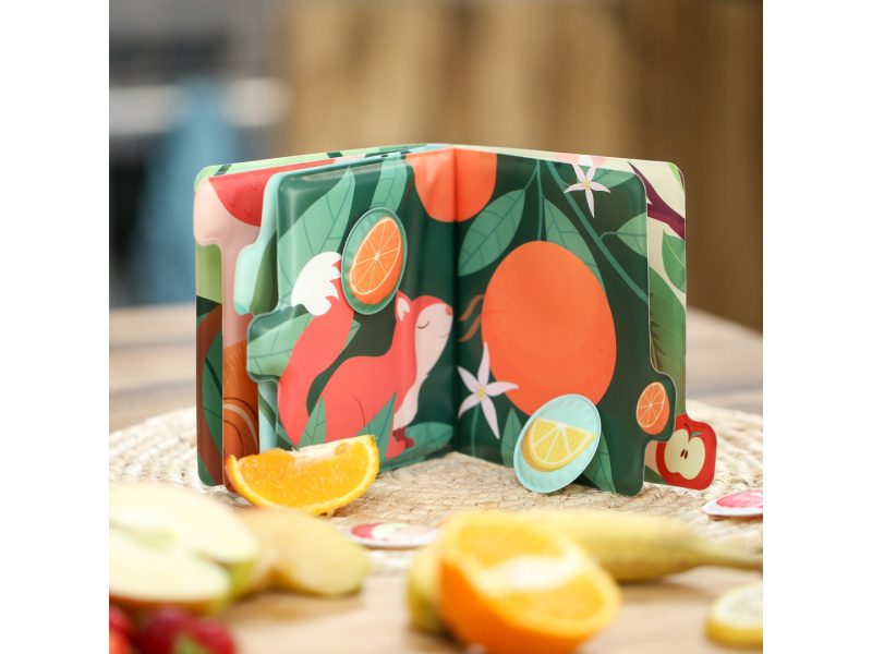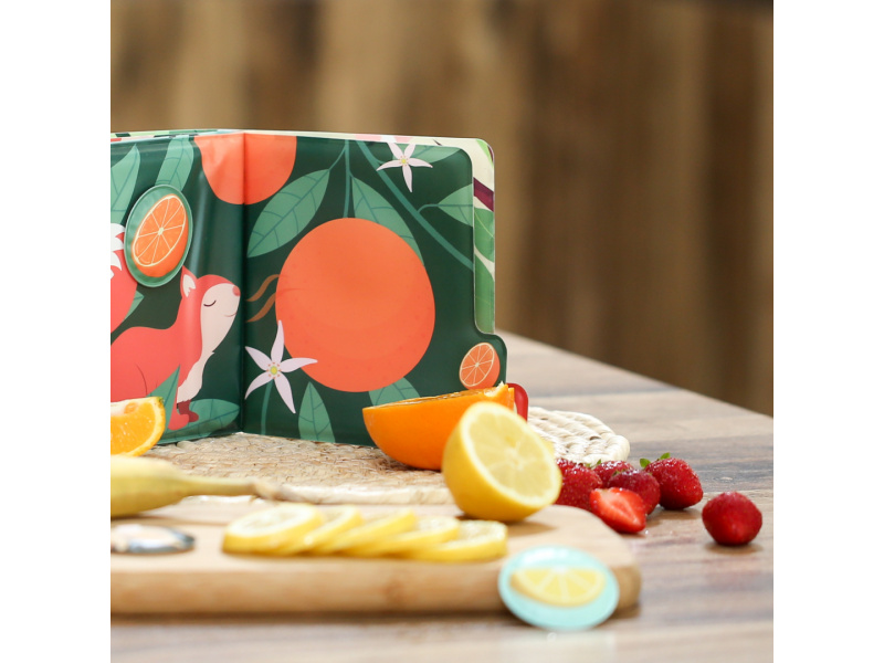 Vůně, barvy a první slova v jedné knížce! Tato interaktivní smyslová kniha s vůní ovoce vtáhne děti do světa chutí a přírody prostřednictvím veselých zvířátek a jejich oblíbeného ovoce. Každá stránka nabízí nová překvapení a probouzí zvídavost i fantazii. Knížka, která zapojí všechny smysly: Barevné ilustrace doplňuje jemná vůně ovoce, která se uvolní po přejetí prstem Děti se hravou formou učí poznávat ovoce, barvy, zvířátka i nová slova Interaktivní čtení podporuje slovní zásobu i smyslové vnímání Hra na přiřazování: Součástí knihy je 5 voňavých samolepek (broskev, pomeranč, jahoda, jablko, hroznové víno), které děti připevňují pomocí suchého zipu na správné místo Skvělá aktivita pro rozvoj čichové paměti, logického myšlení i jemné motoriky Silné stránky a snadno uchopitelné části umožňují i nejmenším čtenářům aktivně objevovat svět kolem sebe. Rozměry knihy: 15 × 15 × 3,5 cm Průměr voňavé samolepky: 5 cm Složení: 100 % PEVA Údržba: otírat vlhkým hadříkem Vhodné pro děti od 12 měsíců