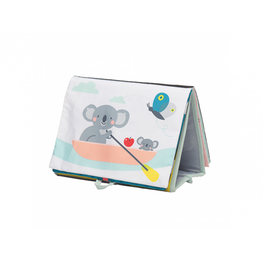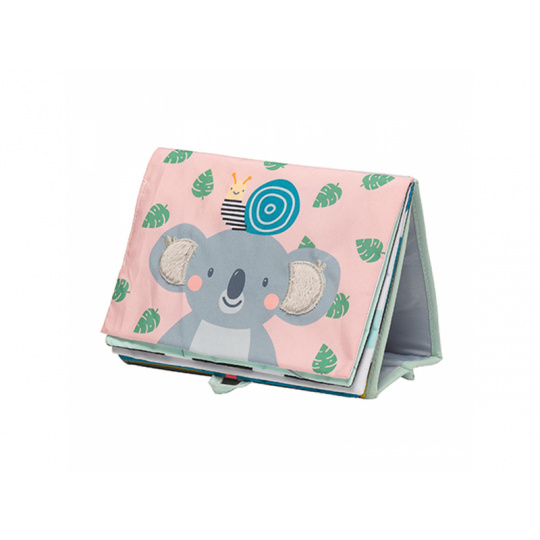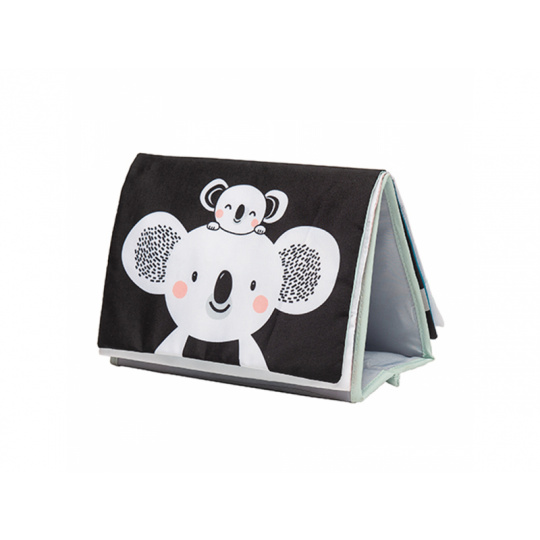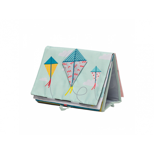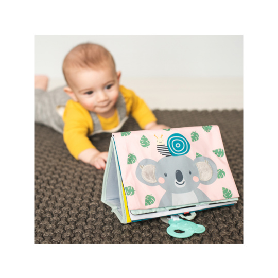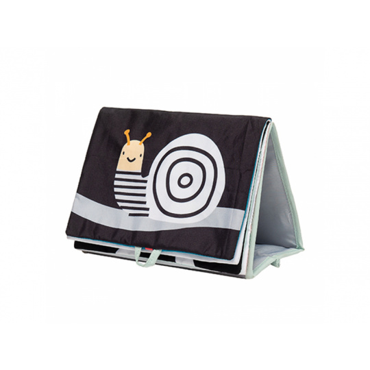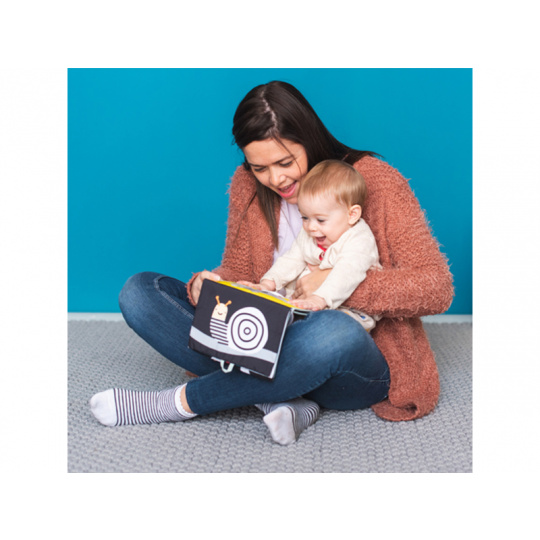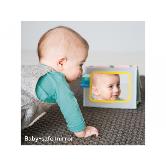 Textilní knížka s otáčecími šustícími stránkami ve tvaru stolního kalendáře nabízí množství neodolatelných obrázků s různorodými texturami, bezpečným zrcátkem, kousátkem apod. Ideální pro postavení před dítě při hře na bříšku. Knížka nabízí dva typy obrázků pro dvě vývojová stádia dítěte: 0-3 měsíce: stránky s bezpečným zrcátkem a vysoce kontrastními jednoduchými obrázky, které podněcují rozvoj smyslů a emoční inteligence dítěte. Od 3 měsíců: strana s barevnými obrázky a různorodými texturami ke zkoumání, které podporují rozvoj smyslů a jemné motoriky dítěte. Rozměry: 20,5 x 19,5 x 7,6 cm Vhodné pro děti od narození.