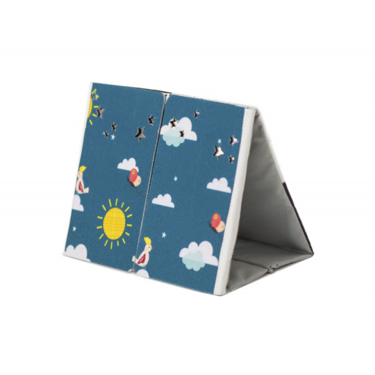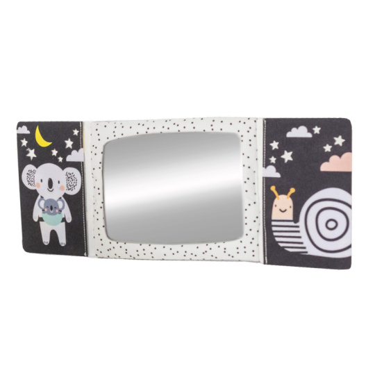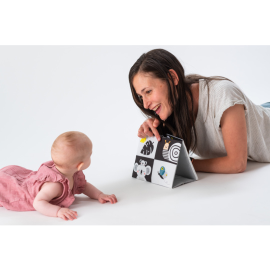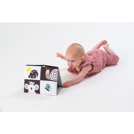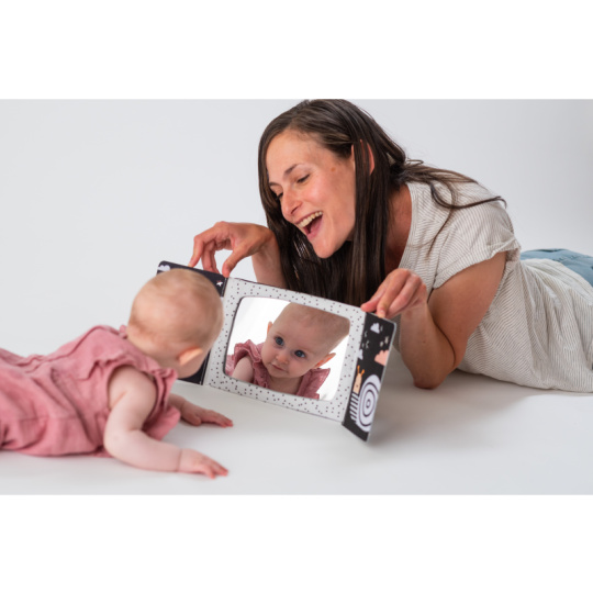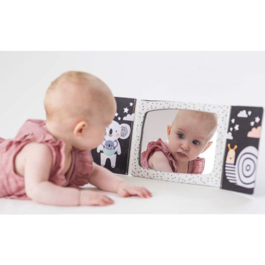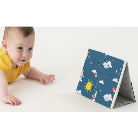 Textilní knížka ve tvaru stolního kalendáře je ideální pro postavení před dítě při hře na bříšku. Neodolatelné vysoce kontrastní obrázky a bezpečné velké zrcátko upoutají pozornost dítěte a pomáhají tak zabavit dítě při hře na bříšku. Zrcátko pomáhá dítěti učit se sebeuvědomění a podněcuje rozvoj jeho zraku a komunikačních dovedností. Zrcátko zakryté chlopněmi knihy lze využít i pro oblíbenou schovávací hru Peek-A-Boo mezi rodičem a dítětem. Knížka nabízí dva typy obrázků pro dvě vývojová stádia dítěte: 0-3 měsíce: bezpečné zrcátko a vysoce kontrastní jednoduché obrázky Od 3 měsíců: výrazné barevné obrázky Rozměry: 18,5 x 13,5 cm Vhodné pro děti od narození.