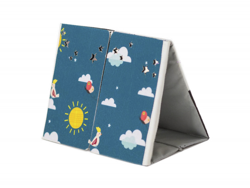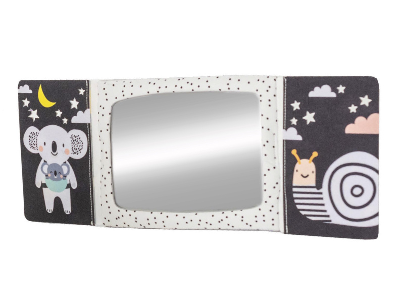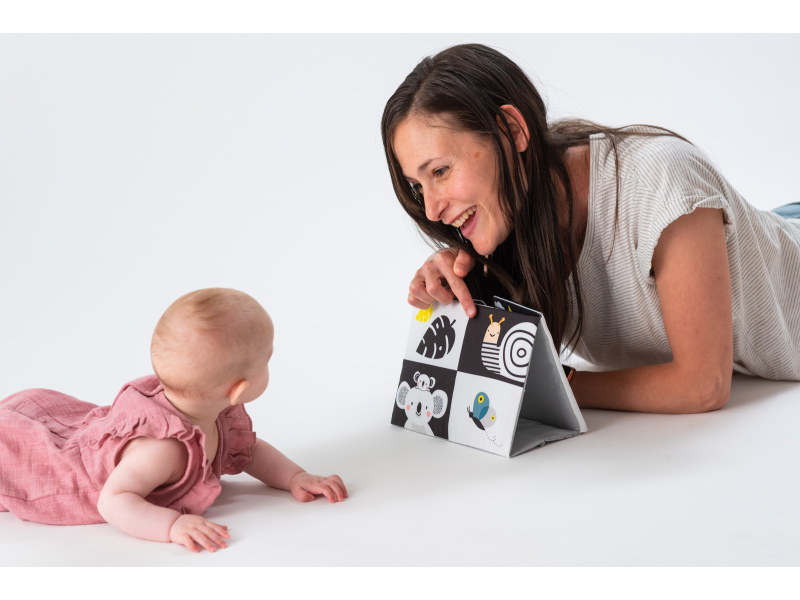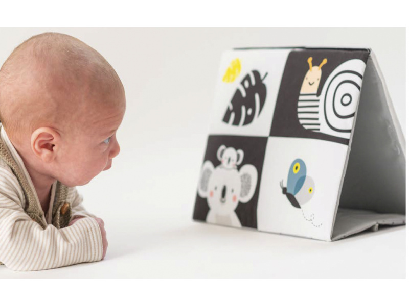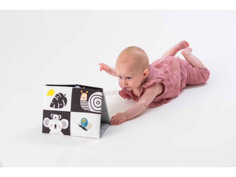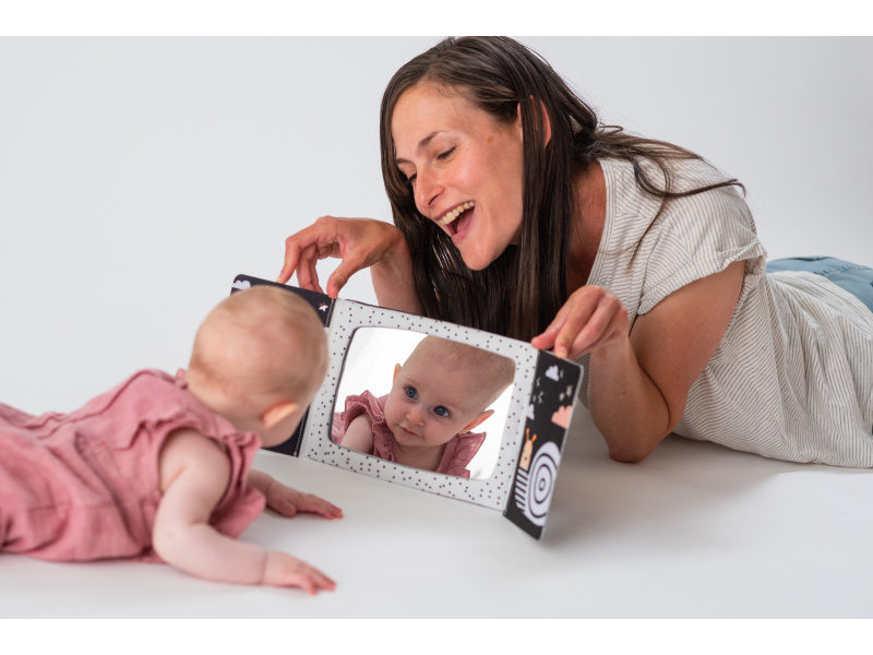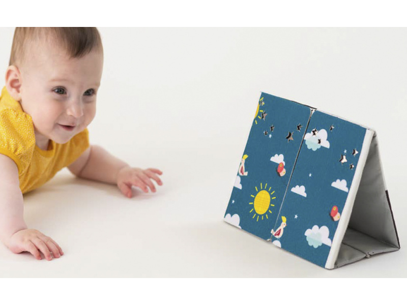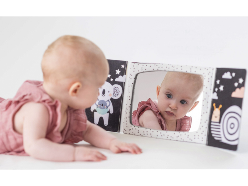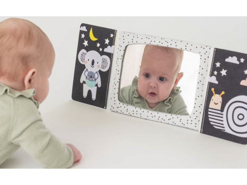 Textilní knížka ve tvaru stolního kalendáře je ideální pro postavení před dítě při hře na bříšku. Neodolatelné vysoce kontrastní obrázky a bezpečné velké zrcátko upoutají pozornost dítěte a pomáhají tak zabavit dítě při hře na bříšku. Zrcátko pomáhá dítěti učit se sebeuvědomění a podněcuje rozvoj jeho zraku a komunikačních dovedností. Zrcátko zakryté chlopněmi knihy lze využít i pro oblíbenou schovávací hru Peek-A-Boo mezi rodičem a dítětem. Knížka nabízí dva typy obrázků pro dvě vývojová stádia dítěte: 0-3 měsíce: bezpečné zrcátko a vysoce kontrastní jednoduché obrázky Od 3 měsíců: výrazné barevné obrázky Rozměry: 18,5 x 13,5 cm Vhodné pro děti od narození.