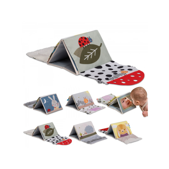 Textilní knížka ve tvaru stolního kalendáře s vysoce kontrastními obrázky je ideální pro postavení před dítě při hře na bříšku. Výrazné obrázky, bezpečné velké zrcátko i šustivé elementy upoutají pozornost dítěte a pomáhají tak zabavit dítě při hře na bříšku. Proč si naši knížku zamilujete? Stimulace smyslů: Každá stránka je vyrobena z různých textur a materiálů, které povzbuzují miminka k prozkoumávání a rozvíjení jejich smyslových dovedností. Podpora zrakového vývoje: Oboustranný design s vysokým kontrastem černobílých vzorů pro nejmenší a pestré ilustrace pro starší miminka pomáhá stimulovat zrak a kognitivní vývoj. Rozvoj dovedností během času na bříšku: Knížka povzbuzuje miminko k zvedání hlavičky, což posiluje krční a horní svaly, důležité pro celkový motorický vývoj. Učení se příčině a následku: Šustící prvky pomáhají miminkům porozumět souvislostem, kdy hrou s knížkou objevují příčinu a následek. Rozměry: 30 x 20 cm Vhodné pro děti od narození.