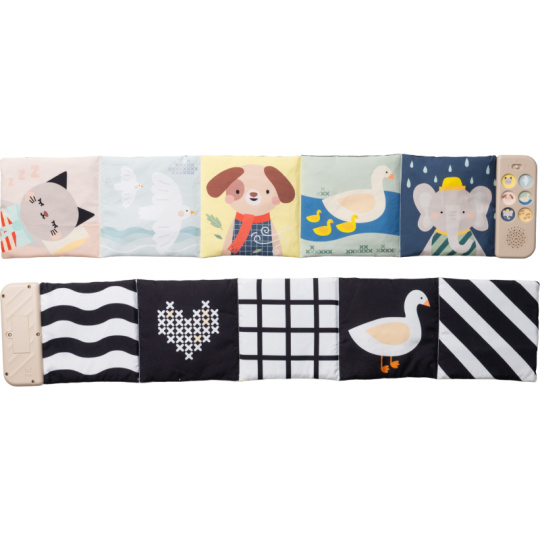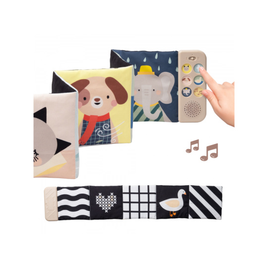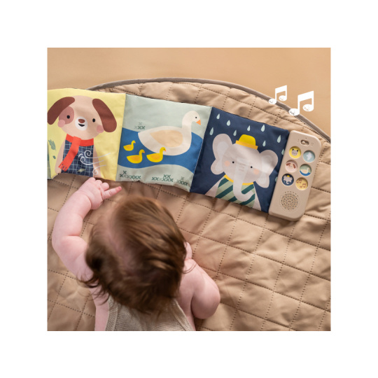 Oboustranná textilní knížka Taf Toys pomůže zabavit a zklidnit miminko už od narození. Knížka samostatně stojí a je tak ideální pro hraní na bříšku. Díky klipům ji snadno umístíte i do kočárku pro zabavení dítěte na cestách. Součástí knížky je hudební modul, který nabízí pět realistických zvuků zvířátek (pes, kočka, slon, kachna a ptáčci), pět zvuků přírody (šumění, mořské vlny, déšť, proudění řeky, tlukot srdce) a sedm minut uklidňujícíh melodií. Zvuky a melodie se snadno pouští pomocí tlačítek. Kniha nabízí dvě strany pro dvě vývojová stádia dítěte - pro děti od narození stranu a vysoce kontrastními, jednoduchými obrázky v základních barvách, pro děti od 3 měsíců stranu s výraznými barevnými obrázky. Hračka podporuje rozvoj jemné motoriky, emoční inteligence, smyslového vnímání i poznávání příčiny a následku. Baterie 2xAAA nejsou součástí balení. Údržba: pouze otírejte, neponořujte do vody Vhodné pro děti od narození.