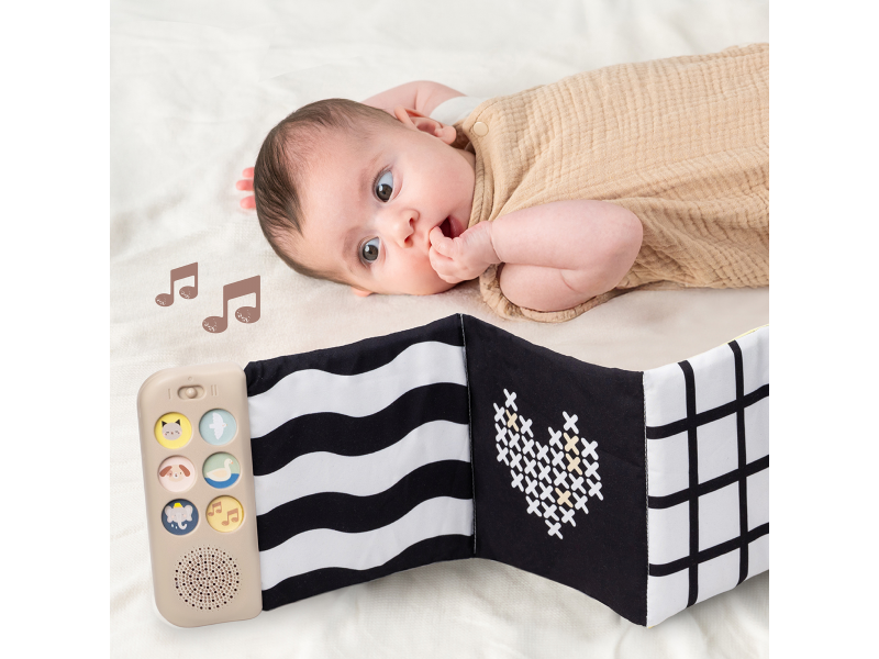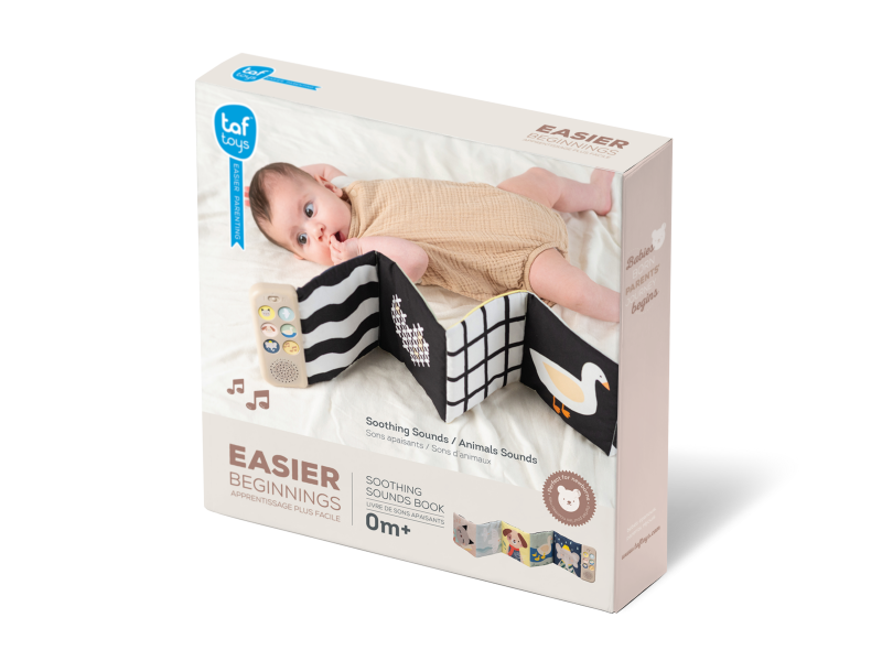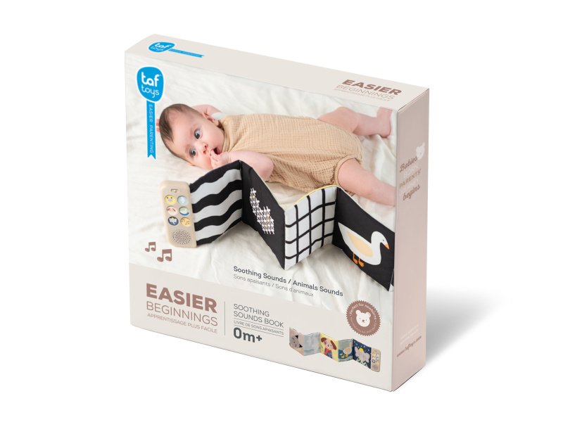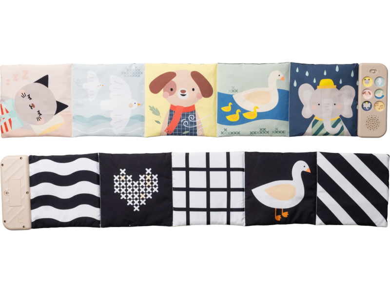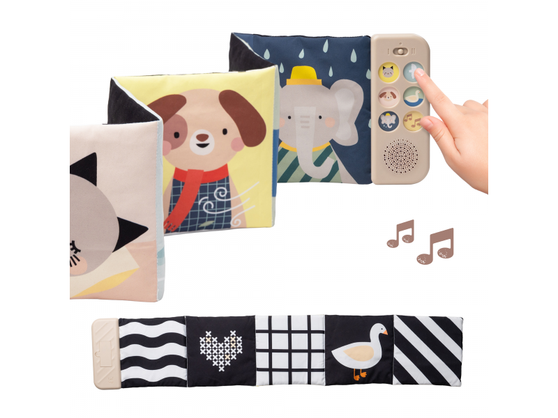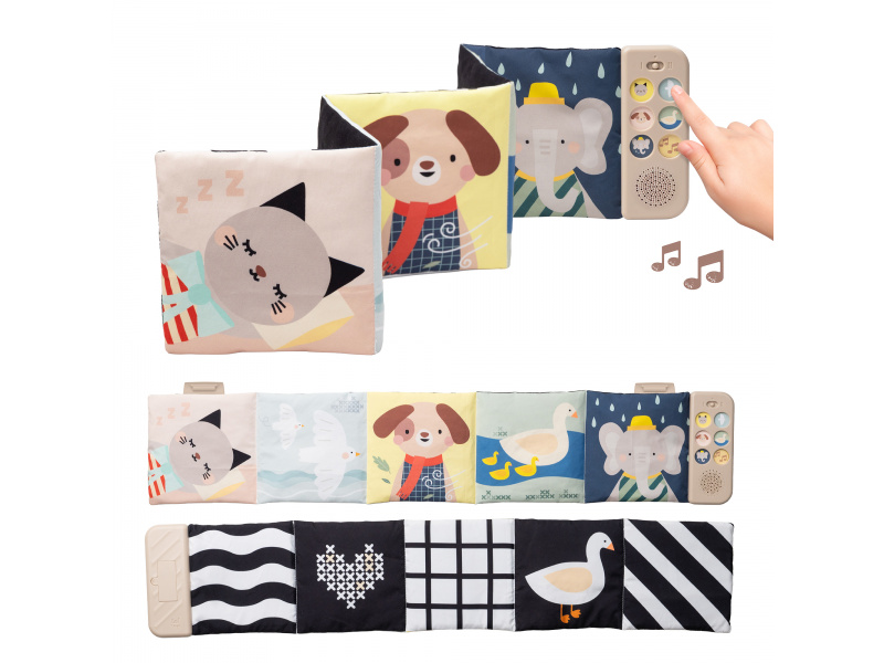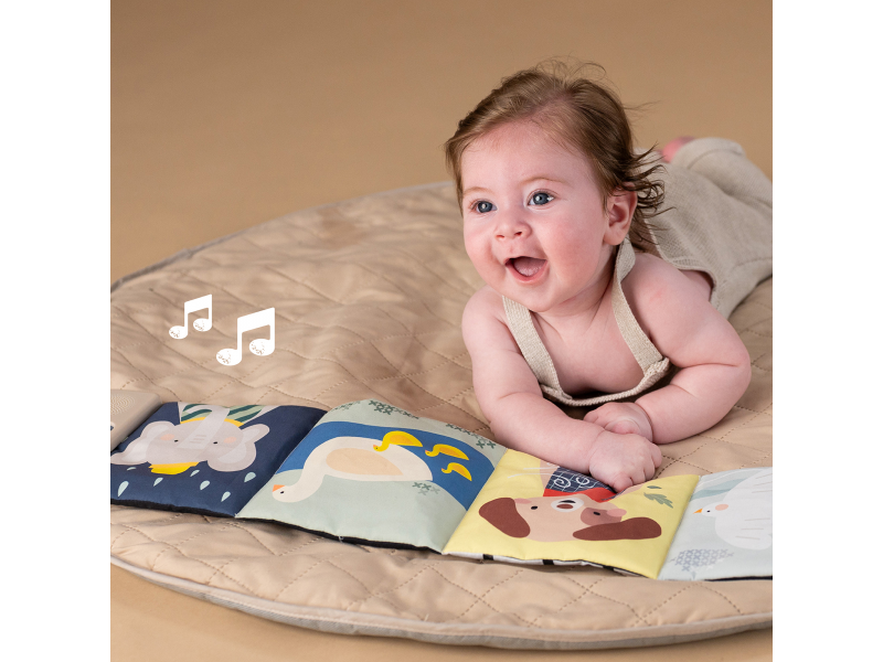Oboustranná textilní knížka Taf Toys pomůže zabavit a zklidnit miminko už od narození. Knížka samostatně stojí a je tak ideální pro hraní na bříšku. Díky klipům ji snadno umístíte i do kočárku pro zabavení dítěte na cestách. Součástí knížky je hudební modul, který nabízí pět realistických zvuků zvířátek (pes, kočka, slon, kachna a ptáčci), pět zvuků přírody (šumění, mořské vlny, déšť, proudění řeky, tlukot srdce) a sedm minut uklidňujícíh melodií. Zvuky a melodie se snadno pouští pomocí tlačítek. Kniha nabízí dvě strany pro dvě vývojová stádia dítěte - pro děti od narození stranu a vysoce kontrastními, jednoduchými obrázky v základních barvách, pro děti od 3 měsíců stranu s výraznými barevnými obrázky. Hračka podporuje rozvoj jemné motoriky, emoční inteligence, smyslového vnímání i poznávání příčiny a následku. Baterie 2xAAA nejsou součástí balení. Údržba: pouze otírejte, neponořujte do vody Vhodné pro děti od narození.