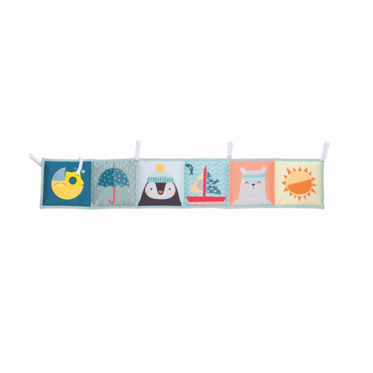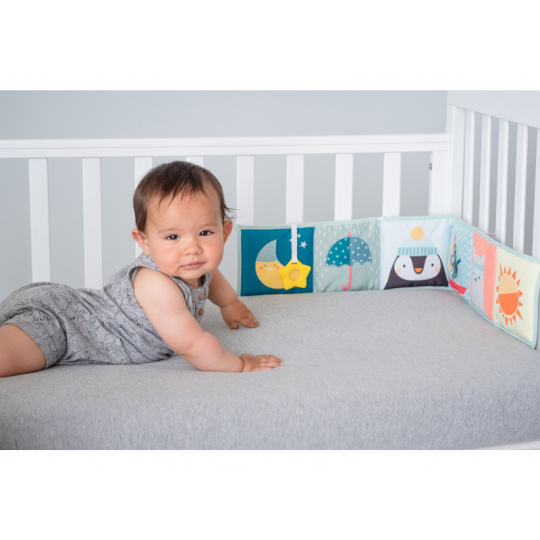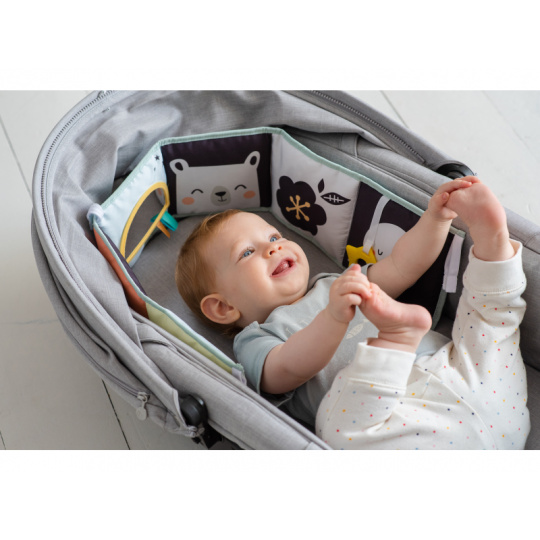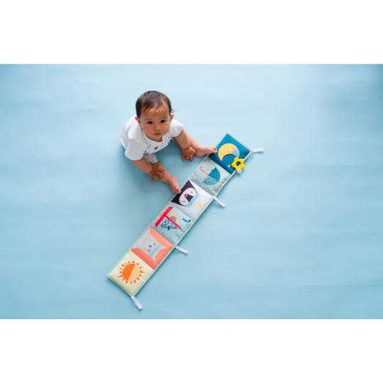 Oboustranná textilní knížka pro nejmenší je určena do kočárku, postýlky i na hrací deku. Kniha nabízí dvě strany pro dvě vývojová stádia dítěte: 0-3 měsíce: strana s bezpečným zrcátkem a vysoce kontrastními obrázky v základních barvách, které podněcují rozvoj smyslů a emoční inteligence dítěte. Od 3 měsíců: strana s barevnými obrázky a různorodými texturami ke zkoumání, které podporují rozvoj smyslů a jemné motoriky dítěte. Knížka drží postavená samostatně nebo je možné ji připevnit pomocí poutek se suchým zipem např. na postýlku. Rozměr 14 x 85 cm. Vhodné od narození.