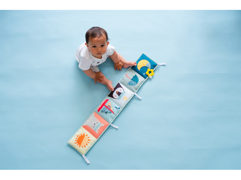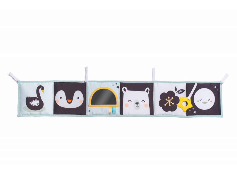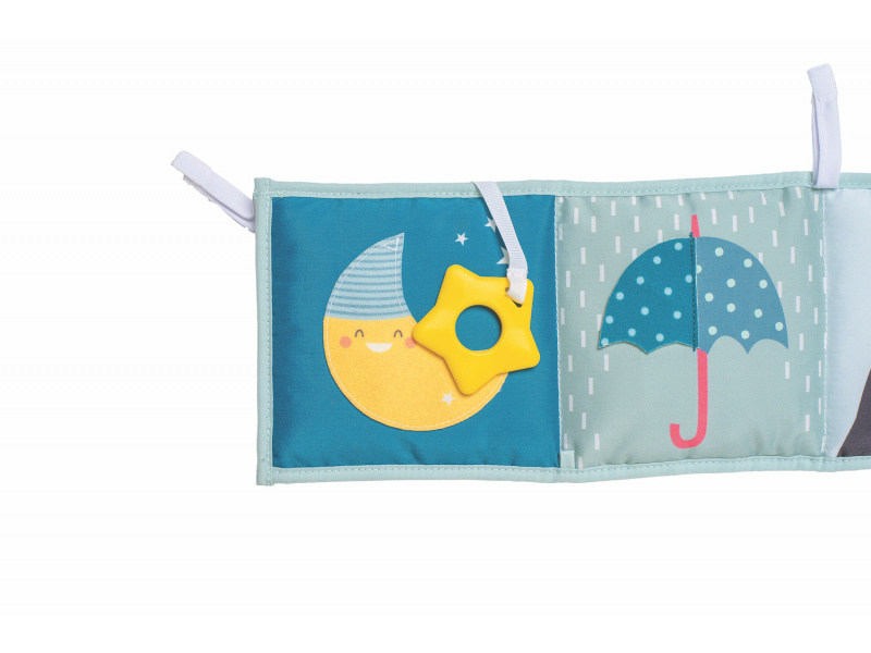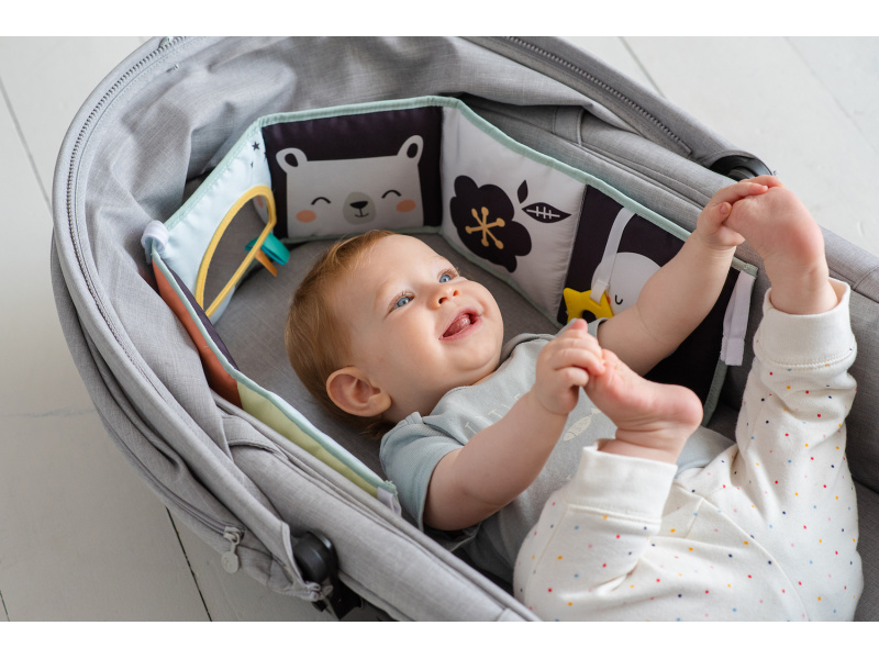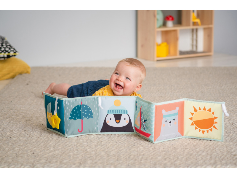 Oboustranná textilní knížka pro nejmenší je určena do kočárku, postýlky i na hrací deku. Kniha nabízí dvě strany pro dvě vývojová stádia dítěte: 0-3 měsíce: strana s bezpečným zrcátkem a vysoce kontrastními obrázky v základních barvách, které podněcují rozvoj smyslů a emoční inteligence dítěte. Od 3 měsíců: strana s barevnými obrázky a různorodými texturami ke zkoumání, které podporují rozvoj smyslů a jemné motoriky dítěte. Knížka drží postavená samostatně nebo je možné ji připevnit pomocí poutek se suchým zipem např. na postýlku. Rozměr 14 x 85 cm. Vhodné od narození.