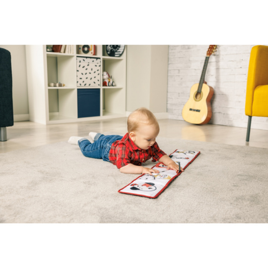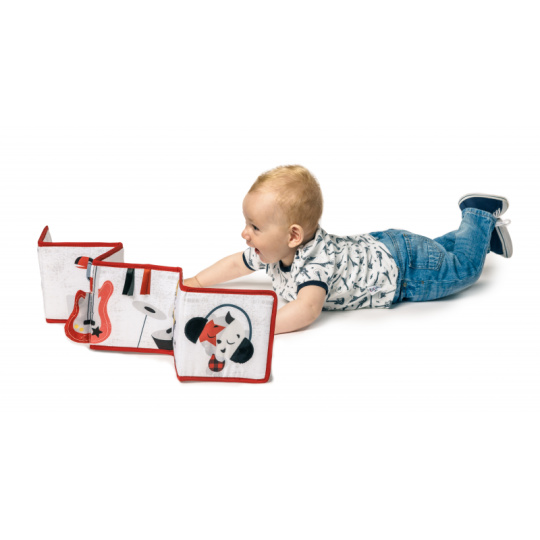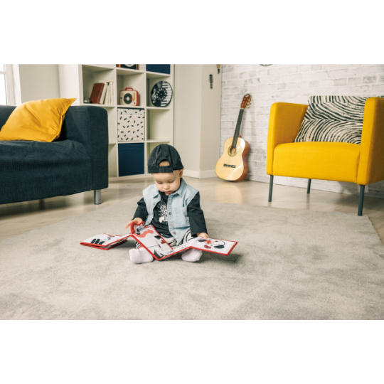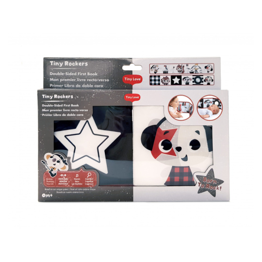 Oboustranná textilní knížka pro nejmenší Tiny Love je určena do kočárku, postýlky i na hrací deku. Kniha nabízí dvě strany pro dvě vývojová stádia dítěte: 0-3 měsíce: strana s bezpečným zrcátkem a vysoce kontrastními, jednoduchými obrázky v základních barvách, které podněcují rozvoj smyslů a emoční inteligence dítěte. Od 3 měsíců: strana s barevnými obrázky a různorodými texturami ke zkoumání, které podporují rozvoj smyslů a jemné motoriky dítěte. Vhodné pro děti od narození.
