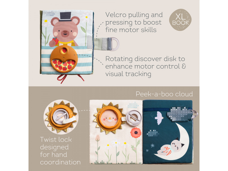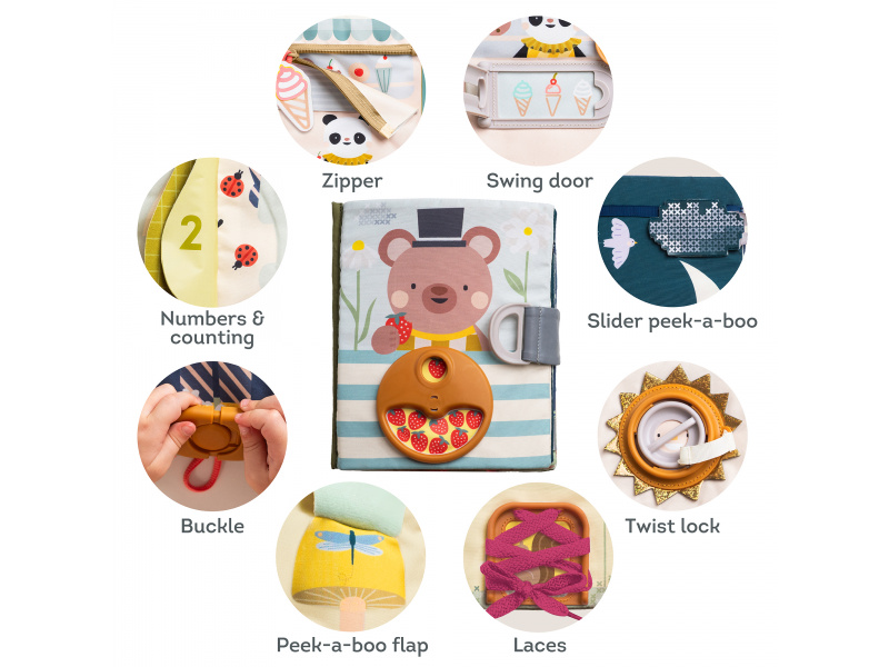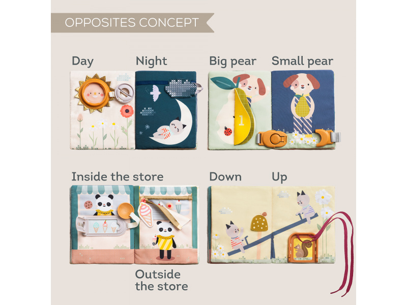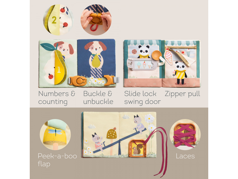 Objevování světa protikladů nebylo nikdy zábavnější! Tato barevná a interaktivní kniha plná různorodých aktivit představuje dětem základní pojmy jako velký & malý nebo den & noc a přitom rozvíjí jemnou motoriku, jazyk i první matematické dovednosti. 15 interaktivních aktivit - zipy, přezky, tkaničky nebo schovávačky – vše, co malé ručičky potřebují k procvičení dovedností jako je zapínání, vázání a oblékání Praktická na cesty - lehká a kompaktní, zabaví dítě kdykoliv a kdekoliv, ideální do auta, do kočárku nebo na návštěvu Co rozvíjí: Jemnou motoriku - zipování, zapínání a další aktivity posilují koordinaci ruky a prstů, přípravují dítě na kreslení a psaní Základy matematiky - hravé úkoly s čísly rozvíjí první matematické dovednosti jako počítání a rozpoznávání čísel Kreativitu a řešení problémů - děti se učí přemýšlet, objevovat a používat svou fantazii prostřednictvím interaktivních ilustrací Vhodné pro děti od 18 měsíců.