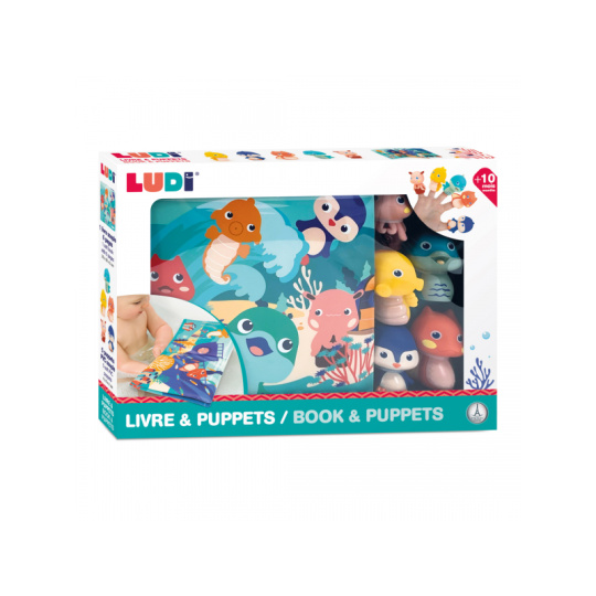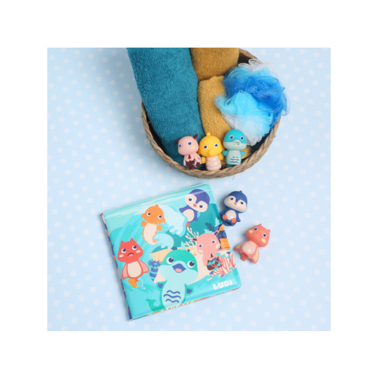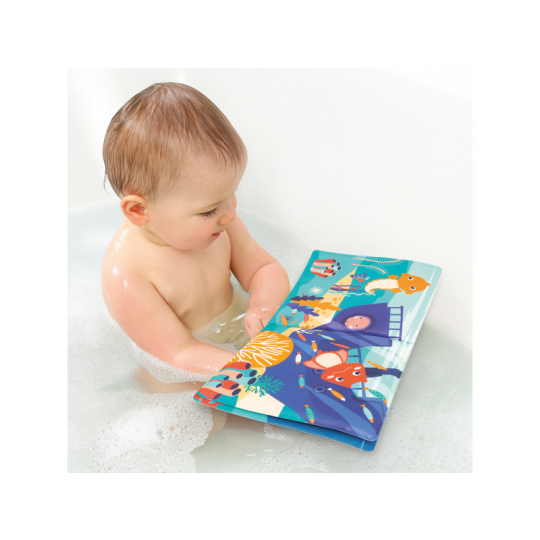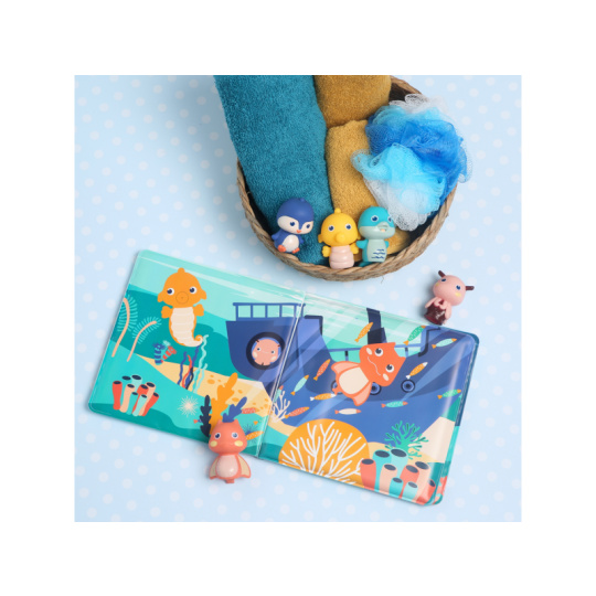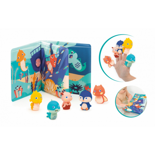 Knížka do koupele se zvířátky, která ožívají v prstech! Tato interaktivní koupací knížka s pěti prstovými maňásky přenese děti pod hladinu moře, kde je čekají barevné ilustrace, veselá zvířátka a neomezený prostor pro fantazii. Ideální do vany, bazénu i mimo vodu – na hraní není nikdy špatný čas! Příběhy, které si děti samy zahrají: Součástí balení je 5 maňásků, odpovídajících zvířátkům v knize Děti si s nimi mohou vymýšlet vlastní příběhy, odehrávat scénky a rozvíjet tak slovní zásobu Maňásci z měkkého materiálu skvěle padnou na dětské prsty a podporují jemnou motoriku a koordinaci Ilustrace zvířat a podmořského světa podněcují zvědavost a rozvoj fantazie Hrátky ve vodě i mimo ni: Materiál PEVA je příjemný, bezpečný a vhodný pro hru ve vodě Maňásci mohou přinést úlevu i při prořezávání zoubků Vše lze snadno opláchnout a nechat oschnout po každém koupání Rozměry knížky: cca 20 × 20 × 2 cm Rozměry maňásků: cca 6 × 4 × 4 cm Složení: PEVA, PVC Údržba: opláchnout čistou vodou a nechat vyschnout Vhodné pro děti od 10 měsíců.