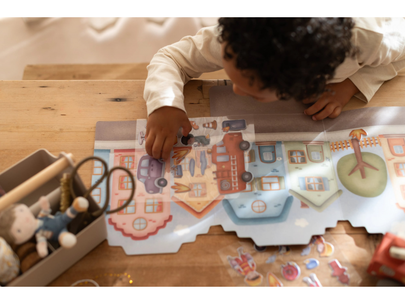 Podpořte dětskou fantazii s touto sadou opakovaně použitelných samolepek Little Dutch. Děti mohou znovu a znovu vyzdobit hasičskou stanici a ulice města více než čtyřiceti veselými 3D samolepkami a pokaždé vytvořit jiný příběh. Samolepky se snadno připevňují i odlepují, což umožňuje nekonečné hraní bez nepořádku. Ideální pro kreativní zábavu doma i na cestách. Vyrobeno z pevného papíru, který vydrží i časté používání. Vhodné pro děti od 3 let.