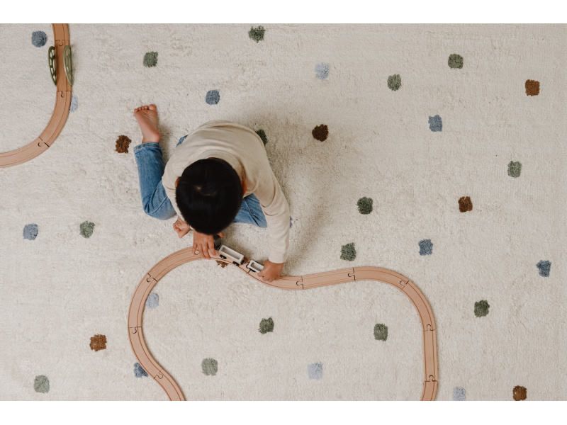 Vneste do dětského pokoje hřejivou a veselou atmosféru s koberečkem od značky Little Dutch! Koberec má béžový podklad zdobený hravými puntíky v modré, zelené a okrově žluté barvě. Třásně na kratších stranách dodávají designu útulný a originální vzhled. Vašemu dítěti se na něm bude krásně sedět a hrát si. Koberec je vyroben je ze 100% organické bavlny s vysokou gramáží a jeho protiskluzová latexová vrstva zajišťuje bezpečné používání. Kobereček lze snadno vyprat v pračce i usušit v sušičce, což usnadňuje jeho údržbu. Rozměry: 120 x 170 cm