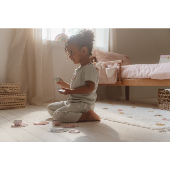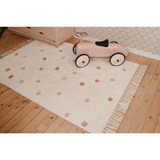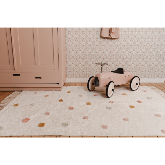 Vneste do dětského pokoje hřejivou a veselou atmosféru s koberečkem od značky Little Dutch! Koberec má béžový podklad zdobený hravými puntíky v růžové, modré a okrově žluté barvě. Třásně na kratších stranách dodávají designu útulný a originální vzhled. Vašemu dítěti se na něm bude krásně sedět a hrát si. Koberec je vyroben je ze 100% organické bavlny s vysokou gramáží a jeho protiskluzová latexová vrstva zajišťuje bezpečné používání. Kobereček lze snadno vyprat v pračce i usušit v sušičce, což usnadňuje jeho údržbu. Rozměry: 120 x 170 cm