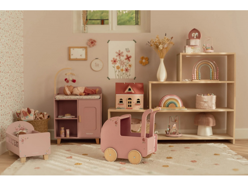 Tento nádherný dřevěný kočárek pro panenky zaujme svým retro designem a něžným květinovým potiskem. Součástí kočárku je měkký polštářek, hřejivá peřinka a pohodlná matrace – vše laděné do jemného květinového designu. Ideální volba pro malé pečovatelky i pečovatele, kteří chtějí své panenky vozit stylově a pohodlně. Kočárek je díky kvalitní dřevěné konstrukci velmi stabilní. Kolečka mají po obvodu gumové kroužky, které zabrání poškrábání podlahy a umožňují nehlučnou jízdu. Nadčasová hračka, která potěší generace dětí a poskytne spoustu radosti při hraní na rodiče. Hračka je součástí kolekce vysoce kvalitních dřevěných hraček Little Dutch, navržených s důrazem na bezpečnost a originální design. Vyrobeno z odolného FSC® certifikovaného dřeva. Rozměry: 41 x 25 x 43,5 cm Vhodné pro děti od 18 měsíců.