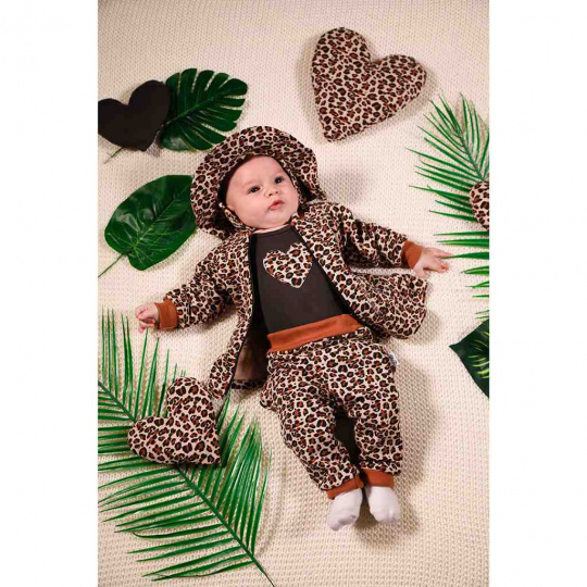 Stylový bavlněný kojenecký klobouček Nicol Mia pro všechny malé parádnice. Klobouček zdobí vzor leopardí srsti a volánek. Zavazuje se na tkaničky. Miminko se v něm bude cítit velmi příjemně a útulně. Mia je nová dechberoucí kolekce navržena s ohledem na potřeby našich nejmenších. Materiál: 95% bavlna, 5% elastan.