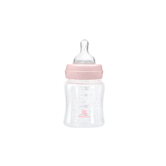 Kojenecká láhev KikkaBoo s krásným potiskem má antikolikovou silikonovou savičku a víčko pro bezpečné uzavření. Široké hrdlo usnadňuje čištění lahvičky. Složení: polypropylen, silikon Rozměry: 13,1 x 5,9 x 5,9 cm Objem: 120 ml Vhodné pro děti od narození.