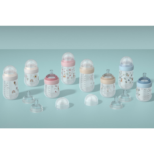 Kojenecká láhev Little Dutch s krásným potiskem a savičkou s antikolikovým ventilem je ideální pro krmení vašeho miminka od narození doma i na cestách. Díky ergonomickému tvaru se lahvička pohodlně drží. Anti-kolikový ventil zajišťuje stálý přísun vzduchu, který pomáhá předcházet křečím a nadýmání tím, že odvádí vzduch od bříška dítěte Savička s pomalým průtokem je vhodná pro děti od narození Spirálový design savičky zabraňuje ucpávání a zajišťuje plynulé sání Přirozený tvar savičky z lékařského silikonu podporuje přirozený způsob krmení a snadný přechod mezi kojením a lahví Široké hrdlo umožňuje snadné plnění i čištění Průhledné víčko slouží k hygienickému uzavření a uchování obsahu Vhodné do myčky nádobí, mikrovlnné trouby, lednice i mrazáku Složení: PP, silikon, bez obsahu BPA Objem: 165 ml Lahvička je součástí designové kolekce hraček a doplňků Little Dutch Forest Friends, inspirované životem v lese. K lahvičce je možné dokoupit náhradní savičky s pomalým, středním a rychlým průtokem. Vhodné pro děti od narození.