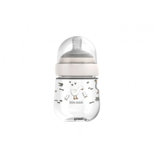 Kojenecká láhev Little Dutch s krásným potiskem a savičkou s antikolikovým ventilem je ideální pro krmení vašeho miminka od narození doma i na cestách. Díky ergonomickému tvaru se lahvička pohodlně drží. Anti-kolikový ventil zajišťuje stálý přísun vzduchu, který pomáhá předcházet křečím a nadýmání tím, že odvádí vzduch od bříška dítěte Savička s pomalým průtokem je vhodná pro děti od narození Spirálový design savičky zabraňuje ucpávání a zajišťuje plynulé sání Přirozený tvar savičky z lékařského silikonu podporuje přirozený způsob krmení a snadný přechod mezi kojením a lahví Široké hrdlo umožňuje snadné plnění i čištění Průhledné víčko slouží k hygienickému uzavření a uchování obsahu Vhodné do myčky nádobí, mikrovlnné trouby, lednice i mrazáku Složení: PP, silikon, bez obsahu BPA Objem: 165 ml Lahvička je součástí designové kolekce hraček a doplňků Little Dutch Forest Husa. K lahvičce je možné dokoupit náhradní savičky s pomalým, středním a rychlým průtokem. Vhodné pro děti od narození.
