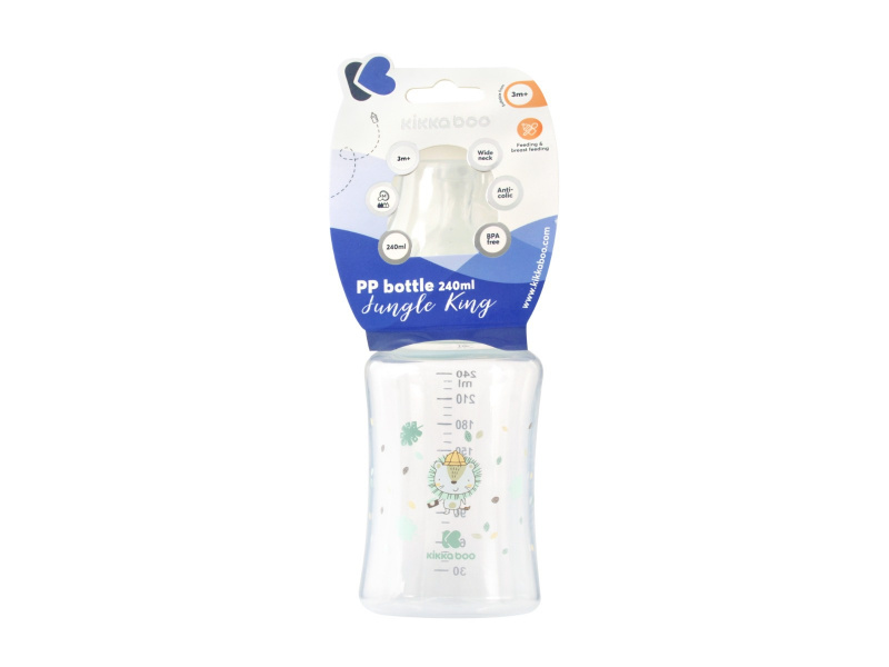 Kojenecká láhev KikkaBoo s krásným potiskem má antikolikovou silikonovou savičku a víčko pro bezpečné uzavření. Široké hrdlo usnadňuje čištění lahvičky. Složení: polypropylen, silikon Rozměry: 16 x 6,6 x 6,6 cm Objem: 240 ml Vhodné pro děti od 3 měsíců.