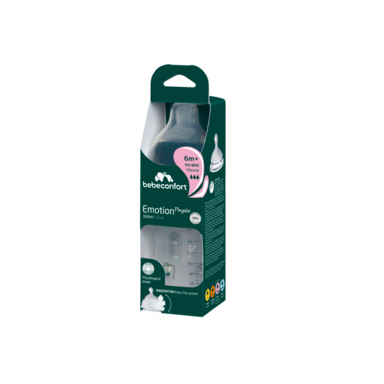 Kojenecká lahvička Bebeconfort Emotion Physio s unikátní silikonovou savičkou fyziologického tvaru je zárukou, že dítě téměř nepociťuje rozdíl mezi kojením a krmením z lahvičky. Lahvička je antikoliková, opatřená dvojitým ventilačním systémem na okraji savičky, který citlivě zabezpečí únik vzduchu z láhve, tím umožní plynulé sání tekutiny a zároveň snižuje riziko břišní koliky. Originální způsob uzavírání láhve Easy Clip je zárukou bezpečného uzavření láhve bez rizika vytečení. Místo šroubování se objímka se savičkou na láhev snadno a rychle zacvakne. Ergonomický tvar lahvičky umožňuje snadné držení během krmení. Víčko chrání čistotu savičky během přenášení či uskladnění. Široké hrdlo usnadňuje plnění i čištění. Lahvička je dodávána se savičkou s rychlým průtokem. Náhradní savičky se prodávají samostatně. Neobsahuje bisfenol A. Vhodné pro děti od 6 měsíců.