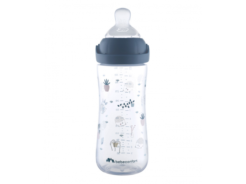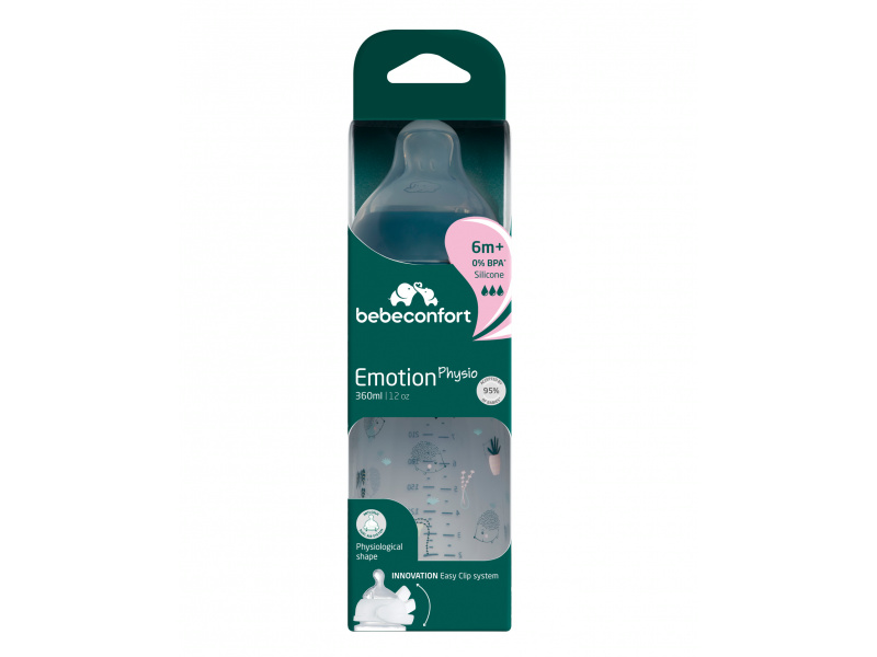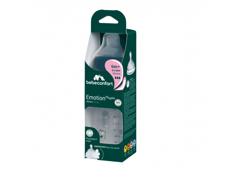 Kojenecká lahvička Bebeconfort Emotion Physio s unikátní silikonovou savičkou fyziologického tvaru je zárukou, že dítě téměř nepociťuje rozdíl mezi kojením a krmením z lahvičky. Lahvička je antikoliková, opatřená dvojitým ventilačním systémem na okraji savičky, který citlivě zabezpečí únik vzduchu z láhve, tím umožní plynulé sání tekutiny a zároveň snižuje riziko břišní koliky. Originální způsob uzavírání láhve Easy Clip je zárukou bezpečného uzavření láhve bez rizika vytečení. Místo šroubování se objímka se savičkou na láhev snadno a rychle zacvakne. Ergonomický tvar lahvičky umožňuje snadné držení během krmení. Víčko chrání čistotu savičky během přenášení či uskladnění. Široké hrdlo usnadňuje plnění i čištění. Lahvička je dodávána se savičkou s rychlým průtokem. Náhradní savičky se prodávají samostatně. Neobsahuje bisfenol A. Vhodné pro děti od 6 měsíců.