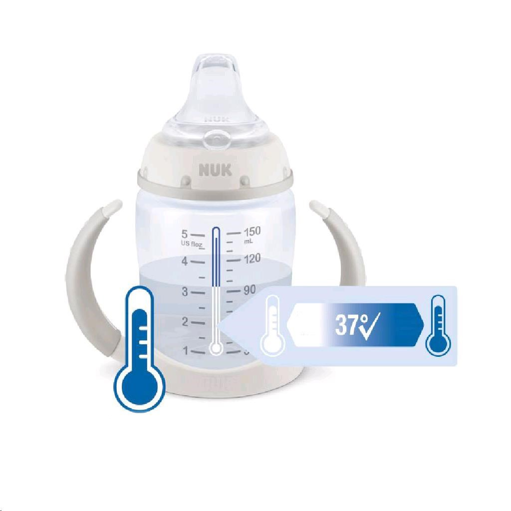 Kojenecká láhev na učení NUK First Choice s kontrolou teploty. Zabudovaný indikátor kontroly teploty změní barvu, pokud je obsah lahvičky příliš horký. Modrá barva indikátoru se změní na bílou. Lahvička miminkům usnadňuje přechod od kojení nebo krmení k samostatnému pití. Kojenecká láhev má měkké silikonové nekapající pítko a nemusíte se bát vylití obsahu. Je ergonomicky tvarovaná a má protiskluzová držátka, takže si dítě může láhev držet samo například i při jízdě v kočárku. Výhodou této super lahvičky je, že se snadno rozmontujete a čistí. Vyrobená z vysoko kvalitného plastu polypropylénu a neobsahuje BPA (Bisfenol A). Vhodné pro děti od 6 do 18 měsíců. Klinicky testováno. Balení obsahuje: