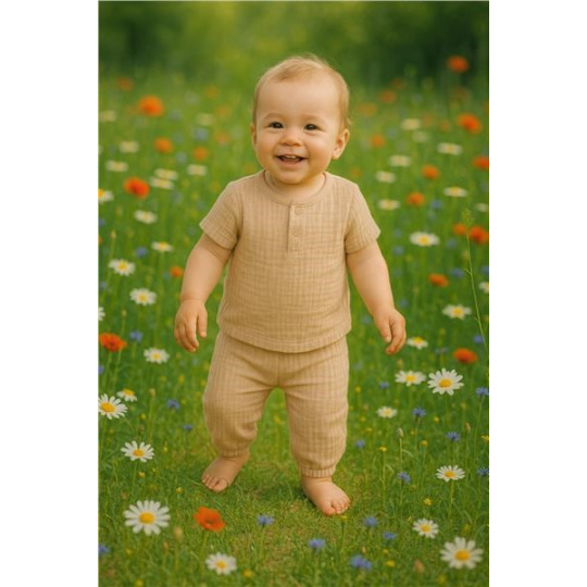 Stylová a praktická 2-dílná dětská souprava české značky New Baby. Mušelínová soupravička se skládá z trička s krátkým rukávem a kalhot. Velmi praktický set pro děti v jarních i letních dnech. Mušelínové tričko je velmi pohodlné už jen tím, že je vyrobeno z kvalitní a prodyšné mušelínové bavlny se zapínáním na cvočky pod krčkem. Mušelínové kalhoty s moderním střihem jsou velmi praktické, v pase a na nohavičkách je gumička, která netlačí.