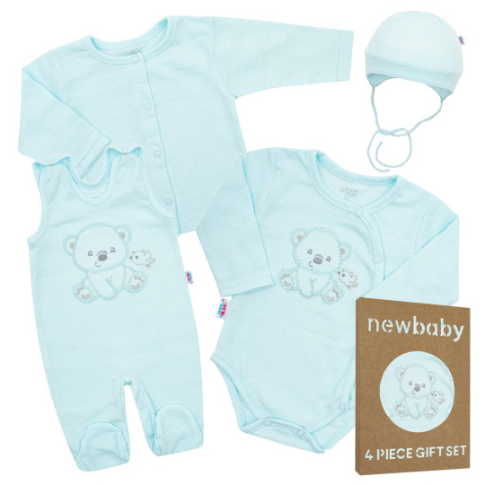 4-dílná soupravička české značky New Baby Sweet Bear pro miminka. Soupravička je vyrobena z kvalitního materiálu, který je vhodný pro miminka a je vhodná nejen do porodnice. Obsahuje celorozepínací body s dlouhým rukávkem, dupačky, kabátek a čepičku. Celorozepínací body zdobí vyšitý obrázek medvídka a ptáčka. Dupačky zdobí roztomilý obrázek medvídka a ptáčka. Zapínání na cvočky na ramínkách a mezi nožičkami. Kabátek je jednobarevný s krásným lemováním okolo ručiček. Zapínání je na cvočky po celé délce. Čepička je krásně tvarovaná na ouška a zavazuje se na tkaničky. Soupravička je v praktické Eko krabičce. Celá soupravička má nový neobyčejný design s atraktivním vzorem látky. Složení: 100% bavlna.