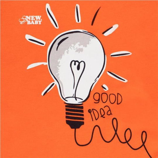 Bavlněné kojenecké tričko české značky New Baby Happy Bulbs. Tričko s dlouhým rukávem a barevným lemem okolo krčku, rukávů a v pase je celopotištěné vtipnými a šťastnými žárovkami s nápisem good idea. Zapínání na ramínku na cvoček usnadní oblékání. Tričko je vyrobené s ohledem na potřeby malých dětí s velmi příjemného materiálu. Složení: 100% bavlna.