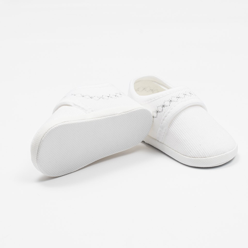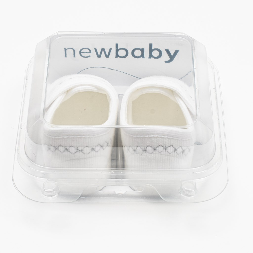Kojenecké capáčky New Baby pro miminka. Krásné botičky s moderním vzhledem na suchý zip, zdobené stříbrnou výšivkou. Capáčky přiléhají k nožičce a mají široký vnitřek, což umožňuje volný pohyb prstů a svalů. Výrobek není určen k chůzi. Jsou velmi lehké s tenkou syntetickou podrážkou. Složení: 100% polyester. Podrážka: syntetický materiál PVC bez BPA. Délka vnitřní stélky 10 cm. Určeno pro děti 0-3 měsíců. Dodáváné v praktické krabičce. Upozornění: pod textilní vložkou se někdy nachází papírová vložka, která drží tvar capáčky. Před prvním použitím odstraňte tuto papírovou vložku.