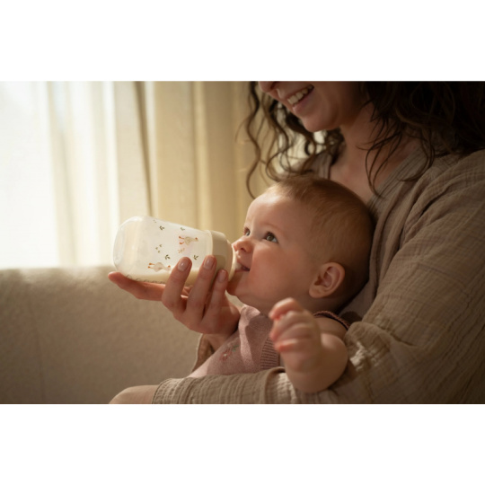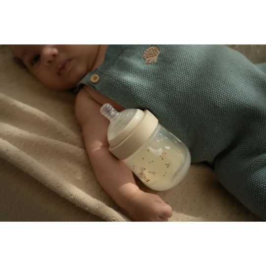 Sada kojeneckých lahví Little Dutch s krásným potiskem a savičkou s antikolikovým ventilem obsahuje dvě láhve (165 ml a 240 ml) se savičkou s pomalým průtokem, vhodné pro děti od narození, a dvě savičky se středním průtokem, vhodné pro děti od 3 měsíců. Kojenecká láhev Little Dutch je ideální pro krmení vašeho miminka od narození doma i na cestách. Díky ergonomickému tvaru se lahvička pohodlně drží. Anti-kolikový ventil zajišťuje stálý přísun vzduchu, který pomáhá předcházet křečím a nadýmání tím, že odvádí vzduch od bříška dítěte Savička s pomalým průtokem je vhodná pro děti od narození, savička se středním průtokem je vhodná pro děti od 3 měsíců Spirálový design savičky zabraňuje ucpávání a zajišťuje plynulé sání Přirozený tvar savičky z lékařského silikonu podporuje přirozený způsob krmení a snadný přechod mezi kojením a lahví Široké hrdlo umožňuje snadné plnění i čištění Průhledné víčko slouží k hygienickému uzavření a uchování obsahu Vhodné do myčky nádobí, mikrovlnné trouby, lednice i mrazáku Složení: PP, silikon, bez obsahu BPA Objem: 165 ml, 240 ml Lahvičky jsou součástí designové kolekce hraček a doplňků Little Dutch Husa. K lahvičkám je možné dokoupit náhradní savičky s pomalým, středním a rychlým průtokem. Vhodné pro děti od narození.