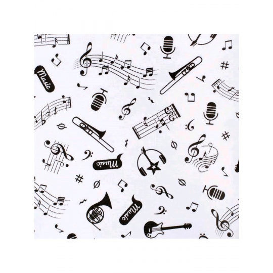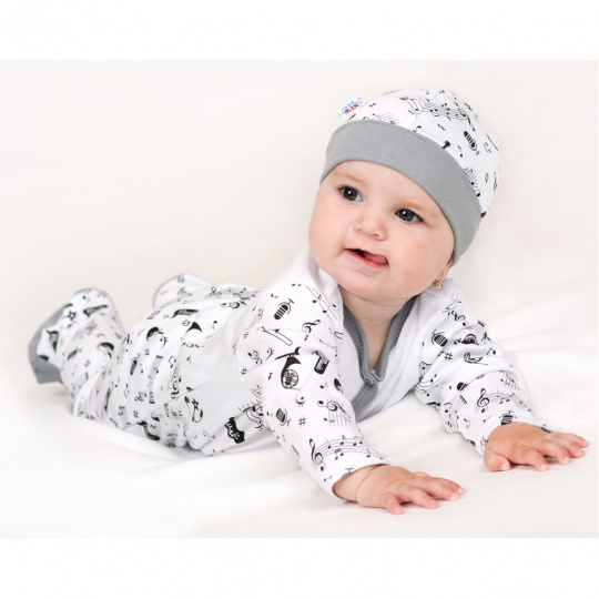 Bavlněný kojenecký overal New Baby Music pro miminka. Dětský overálek má rukávky a spodní část celopotištěnou notičkami a hudebními nástroji. Vrchní část je zdobena roztomilým obrázkem notiček a nápisem Music. Zapínání na cvočky po celé délce a mezi nožičkami. Klademe důraz na kvalitu a proto se díky příjemnému, měkkému a kvalitnímu materiálu, bude Vaše miminko cítit velmi příjemně. Náš overálek je vhodný pro kluky i holčičky. Složení: 100% bavlna. Rozměry: obvod kolem hrudníku cca 54 cm, celková délka cca 65 cm, délka od rozkroku cca 21 cm, délka rukávú cca 25 cm.