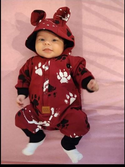 Nápaditý bavlněný kojenecký overal české značky New Baby Paw. Overal je celopotištěný dětským vzorem. Je vyroben z kvalitního bavlněného materiálu s elastanem a bavlněnou podšívkou. Materiál je hladký a příjemný na dotek. Praktické zapínání na cvočky po celé délce velmi usnadní oblékání a přebalování. Overal má praktickou kapuci s oušky, širší pružné lemy na rukách a nohavičkách a celá vnitřní strana je zateplená bavlněnou podšívkou, která zvyšuje komfort nošení. Miminko se bude cítit v overálku velmi pohodlně a příjemně. Složení: 95% bavlna, 5% elastan, podšívka- 95% bavlna, 5% elastan. Vhodné na jaro a na podzim.