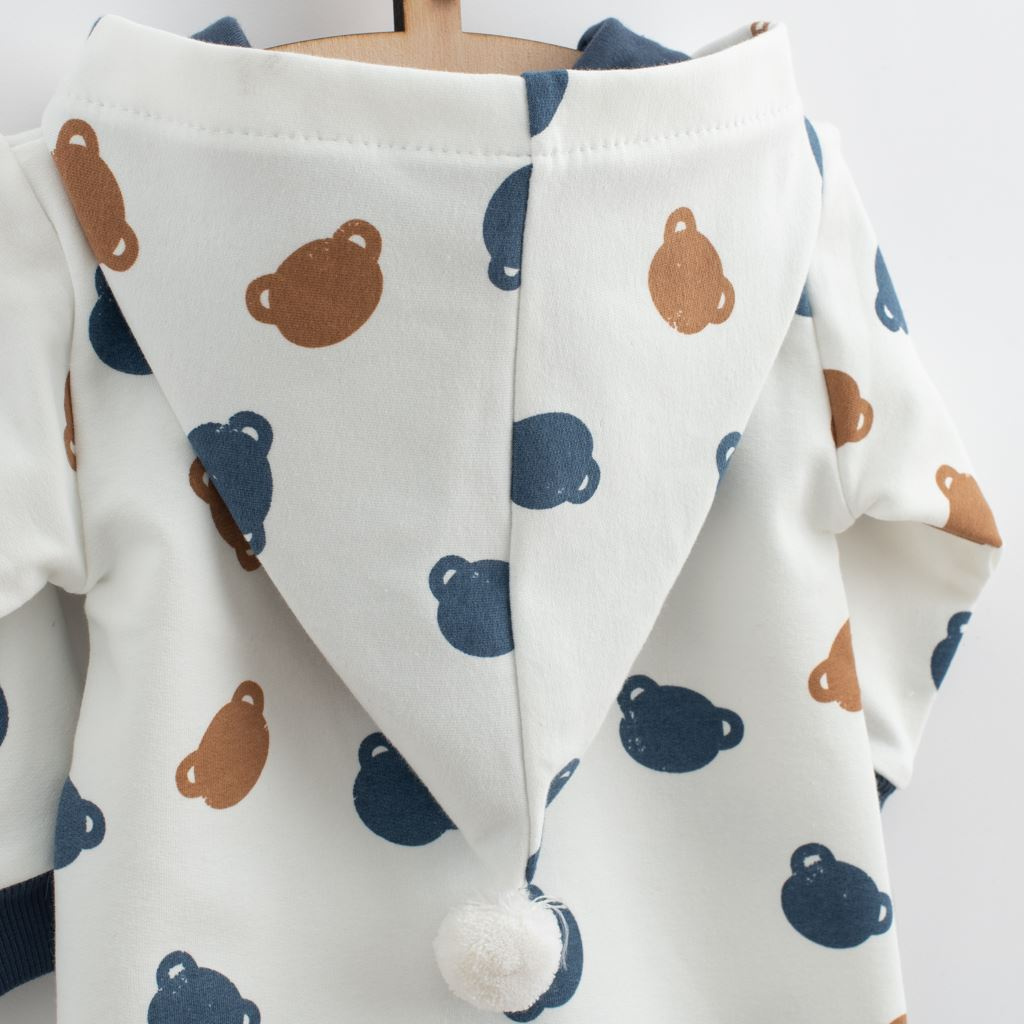 Roztomilý a praktický overal s kapucí české značky New Baby Little One. Overálek je celopotištěný medvídky, má zapínání na zip po celé délce a pružné lemy na rukávcích a nohavičkách. Kapuce je podšitá barevnou podšívkou a je zdobena roztomilou bambulkou. Overal je vyroben z pohodlné teplákoviny. Vhodný pro celoroční nošení. Materiál: 96% bavlna, 4% elastan.