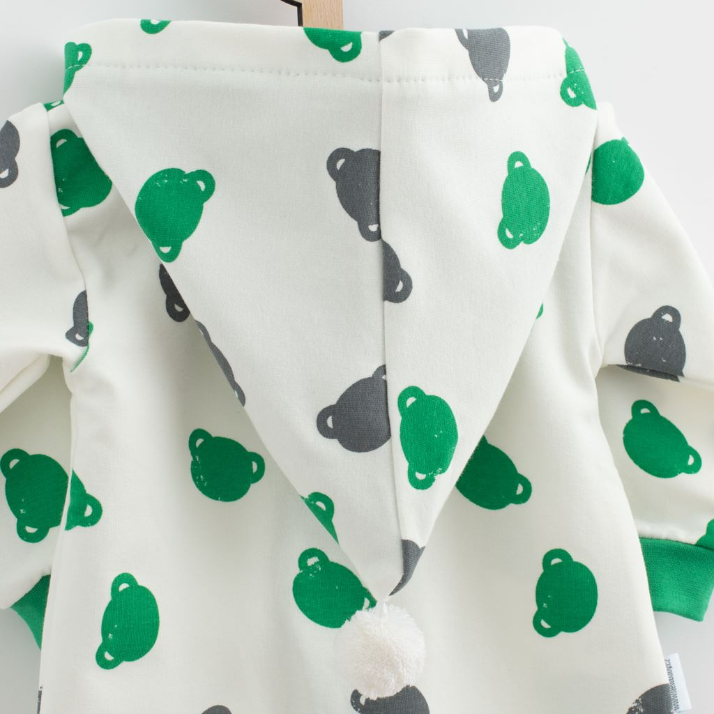 Roztomilý a praktický overal s kapucí české značky New Baby Little One. Overálek je celopotištěný medvídky, má zapínání na zip po celé délce a pružné lemy na rukávcích a nohavičkách. Kapuce je podšitá barevnou podšívkou a je zdobena roztomilou bambulkou. Overal je vyroben z pohodlné teplákoviny. Vhodný pro celoroční nošení. Materiál: 96% bavlna, 4% elastan.