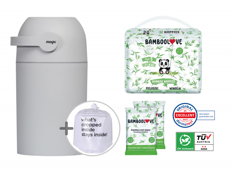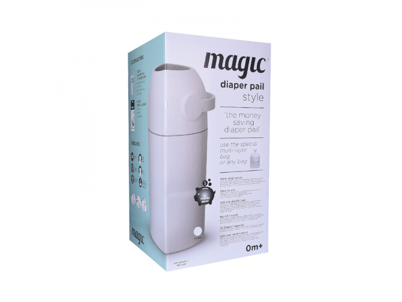 Patentovaný koš na pleny Magic poskytuje ochranu před nepříjemnými pachy a bakteriemi v dětském pokoji nebo kdekoli ve vašem interiéru. Použitou plenu snadno vložíte do koše bez jakéhokoli kontaktu s plenkami, které již v koši jsou. Otočením držadla plena propadne do koše a jeho otočením zpátky je koš opět připraven pro další použití. To vše jednou rukou, takže druhou můžete držet vaše miminko. Speciální systém těsnění udržuje zápach uvnitř koše. Koš o objemu 40 l pojme cca 25 plen (počet plen záleží na jejich velikosti), takže vám jeho kapacita vystačí na několik dní. I vyprázdnění koše je navrženo tak, aby se neuvolnil zápach v koši nahromaděný. Koš v moderním, minimalistickém designu dokonale zapadne do každého interiéru. Když dítě vyroste, můžete koš i nadále používat na odpadky. Koš je vybaven i dětskou pojistkou. Použití koše je velmi ekonomické, protože nevyžaduje nákup speciálních náplní. Koš je určen pro použití s běžnými sáčky na odpadky. Pro maximální ochranu před zápachem doporučujeme použití originálních sáčků navržených do košů na pleny Magic. Tyto sáčky jsou vyrobeny z extra silného, 3-vrstvého materiálu, který brání protékání. Balení koše obsahuje roli s 15 ks sáčků zdarma. Jedna role vystačí na cca 375 plen (počet plen záleží na jejich velikosti). Materiál: PP Rozměry: 52 x 26 x 26 cm