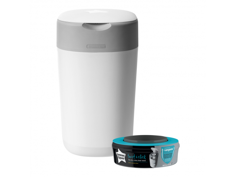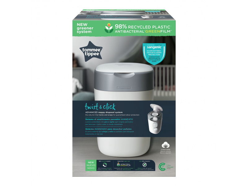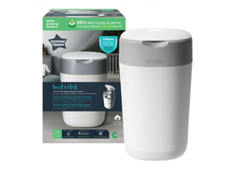 Nový, ekologičtější designový koš na jednorázové pleny Sangenic Twist & Click umožňuje bezdotykové zabalení použitých plen. Koš je vyroben z více než 98% z recyklovaného a recyklovatelného plastu. Výměnná kazeta, která je součástí koše, obsahuje 100% recyklovatelnou PE fólii GREENFILM™, vyrobenou z obnovitelného zdroje - cukrové třtiny. Nepropustná fólie GREENFILM™ ve výměnné kazetě obsahuje antibakteriální složku, která zničí 99% bakterií. Příjemná citronová vůně fólie přispívá k ochraně dětského pokoje před zápachem. Díky technologii Twist & Click se plena v koši zabalí do fólie a s pomocí pístu je zatlačena do koše. Plenu do fólie zabalíte otáčením mechanismu pod víkem, kliknutí indikuje úplné zabalení a pomáhá vám tak šetřit spotřebu fólie. Koš se stane nezbytnou součástí vaší domácnosti po celou dobu, kdy vaše dítě používá pleny. Nemusíte se obávat zápachu v místnosti, kde je koš umístěný, ani toho, že se do zkoumání použitých plen pustí vaše zvědavé batole či domácí mazlíček. Koš proto můžete mít s klidným srdcem umístěný vedle přebalovacího pultu v dětském pokoji, aby byl během přebalování vždy po ruce. V případě, že je dítě nemocné, nemusíte mít obavy z šíření bakterií z použitých plen na ostatní členy rodiny. Špičkový design koše skvěle doplní váš moderní interiér. Kapacita jedné kazety je až 84 plen (vel. 5-9 kg), při spotřebě 3 plen denně tak jedna kazeta vydrží až jeden měsíc používání. Díky tomu, že koš pojme cca 30 plen, není potřeba jej často vynášet a ušetříte tak mnoho cest k popelnici. Koš obsahuje jednu výměnnou kazetu s fólií GREENFILM™. Náhradní výměnné kazety se prodávají samostatně. Rozměry koše bez víka: Š 28 cm x H 25 cm x V 36 cm