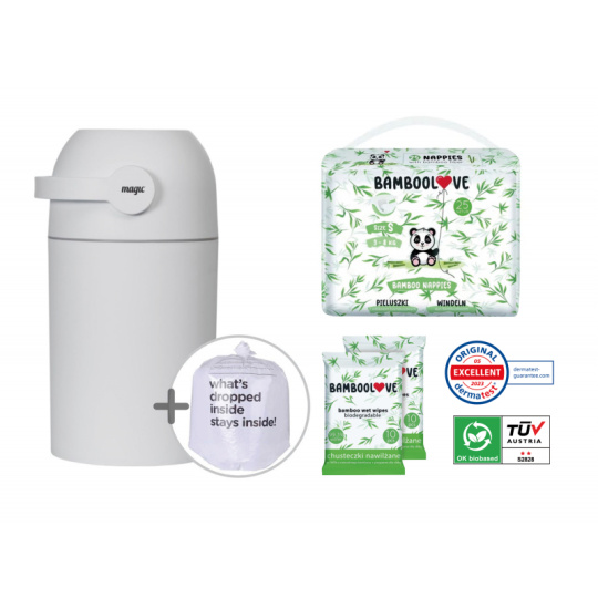Patentovaný koš na pleny Magic poskytuje ochranu před nepříjemnými pachy a bakteriemi v dětském pokoji nebo kdekoli ve vašem interiéru. Použitou plenu snadno vložíte do koše bez jakéhokoli kontaktu s plenkami, které již v koši jsou. Otočením držadla plena propadne do koše a jeho otočením zpátky je koš opět připraven pro další použití. To vše jednou rukou, takže druhou můžete držet vaše miminko. Speciální systém těsnění udržuje zápach uvnitř koše. Koš o objemu 40 l pojme cca 25 plen (počet plen záleží na jejich velikosti), takže vám jeho kapacita vystačí na několik dní. I vyprázdnění koše je navrženo tak, aby se neuvolnil zápach v koši nahromaděný. Koš v moderním, minimalistickém designu dokonale zapadne do každého interiéru. Když dítě vyroste, můžete koš i nadále používat na odpadky. Koš je vybaven i dětskou pojistkou. Použití koše je velmi ekonomické, protože nevyžaduje nákup speciálních náplní. Koš je určen pro použití s běžnými sáčky na odpadky. Pro maximální ochranu před zápachem doporučujeme použití originálních sáčků navržených do košů na pleny Magic. Tyto sáčky jsou vyrobeny z extra silného, 3-vrstvého materiálu, který brání protékání. Balení koše obsahuje roli s 15 ks sáčků zdarma. Jedna role vystačí na cca 375 plen (počet plen záleží na jejich velikosti). Materiál: PP Rozměry: 52 x 26 x 26 cm