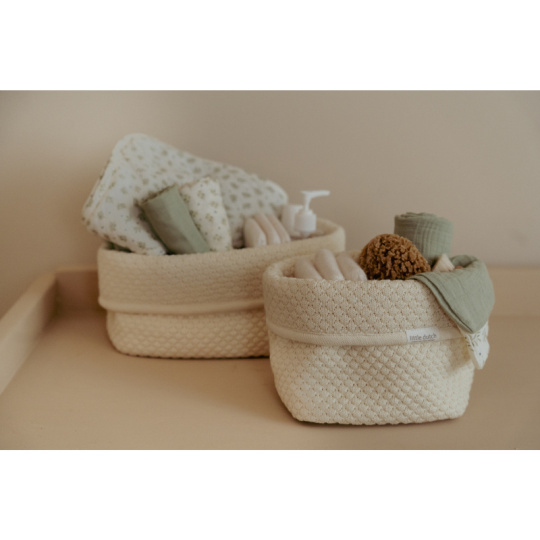 Košík v krásném pleteném provedení je vyroben z pevného bavlněného materiálu. Využijete jej pro přehledné uložení všeho, co potřebujete mít po ruce při každodenní péči o vaše miminko. Ohrnovací okraj umožňuje přizpůsobit výšku košíku vašim potřebám. Košík bude zároveň krásným doplňkem na přebalovacím pultu či poličce v dětském pokoji. Složení: 100% organická bavlna, uvnitř 100% bavlna s LDPE zátěrem Rozměry: 15 x 15 x 15 cm