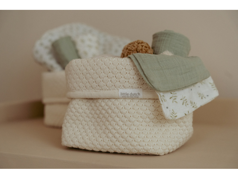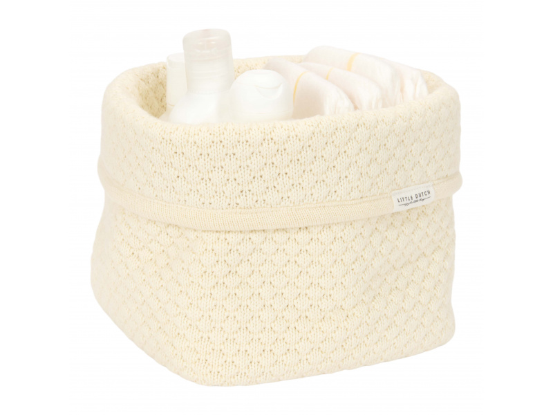 Košík v krásném pleteném provedení je vyroben z pevného bavlněného materiálu. Využijete jej pro přehledné uložení všeho, co potřebujete mít po ruce při každodenní péči o vaše miminko. Ohrnovací okraj umožňuje přizpůsobit výšku košíku vašim potřebám. Košík bude zároveň krásným doplňkem na přebalovacím pultu či poličce v dětském pokoji. Složení: 100% organická bavlna, uvnitř 100% bavlna s LDPE zátěrem Rozměry: 15 x 15 x 15 cm