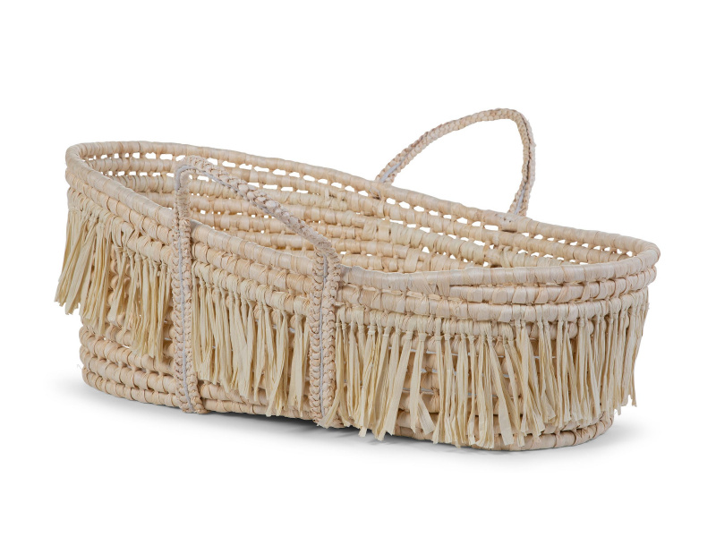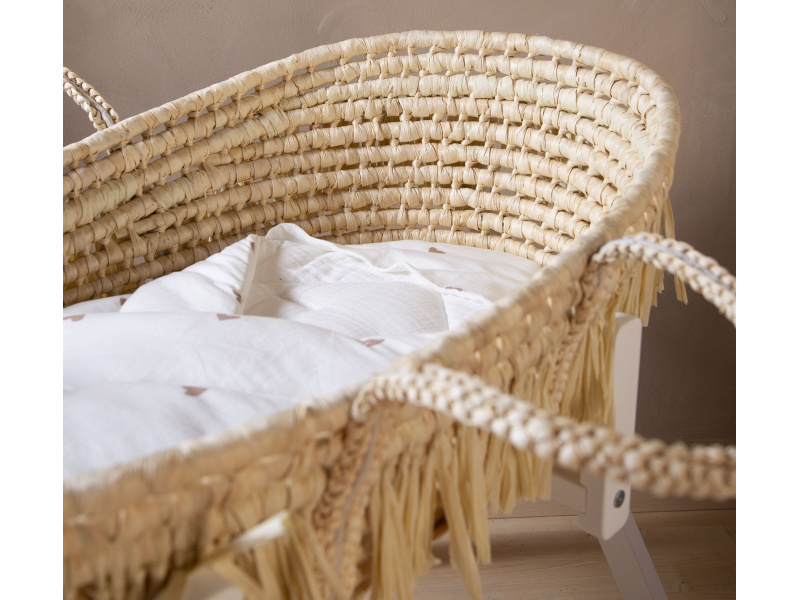 Košík na miminko v krásném přírodním designu s dekorativními třesněmi je vyroben z kukuřičných vláken a jeho součástí je měkká matrace. Držadla usnadňují přenášení prázdného košíku. Ke košíku je možné dokoupit samostatně prodávaný textilní potah nebo dřevěný stojan. Složení: Košík: kukuřičné vlákno, třásně: papír, matrace: 55% bavlna, 45% polyester, výplň matrace: 100% polyester Košík je vhodný pro miminko od narození. Rozměry: 84 x 47 x 29 cm