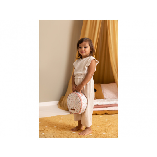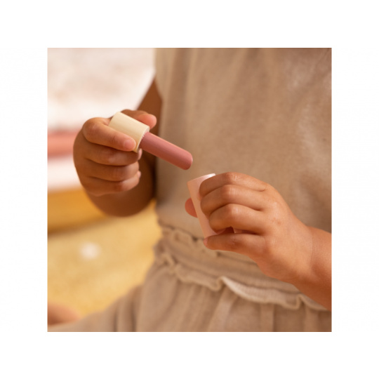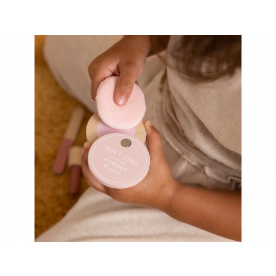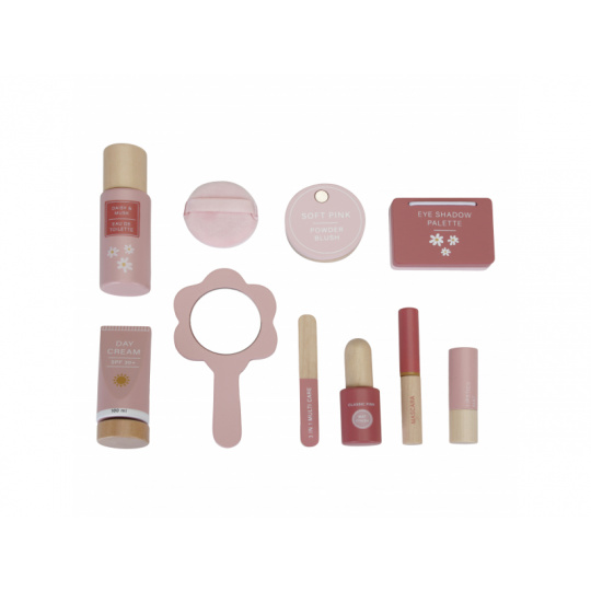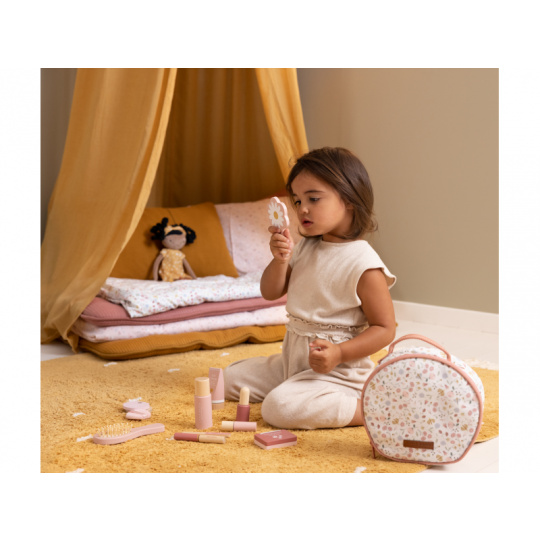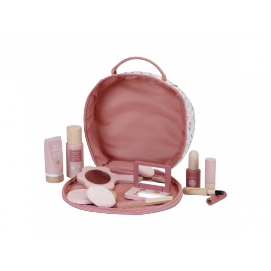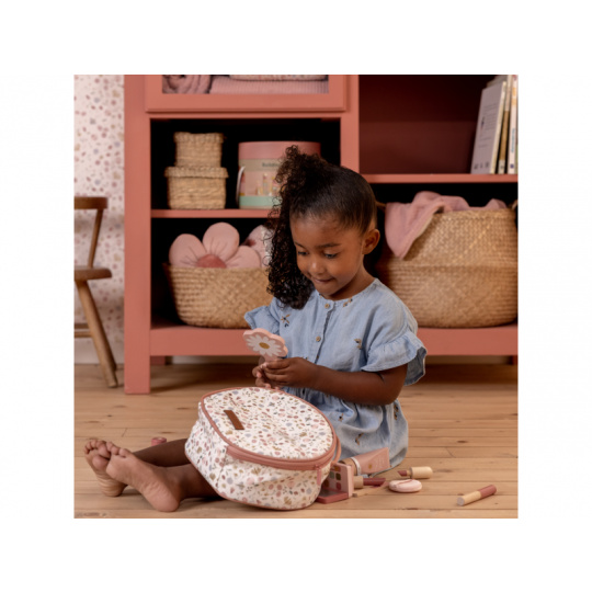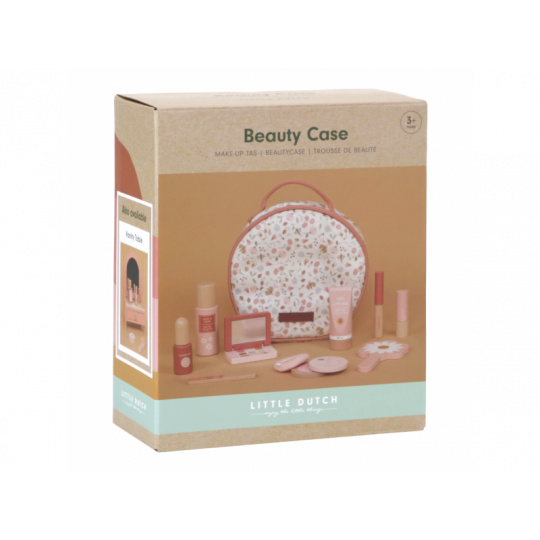 Kosmetická taštička na zip s krásným květinovým vzorem v sobě skrývá kompletní kosmetickou výbavu pro vaši malou parádnici. V taštičce najdete ruční zrcátko, lahvičku s parfémem, tubu s krémem, rtěnku, lak na nehty, pudr na obličej, labutěnku, oční stíny, řasenku a pilník na nehty. Vše v krásném dřevěném provedení, které je zárukou dlouhé životnosti a hraní bez nepořádku. Rozměry: 21 x 21,7 x 9 cm Vhodné pro děti od 3 let.