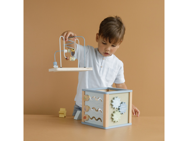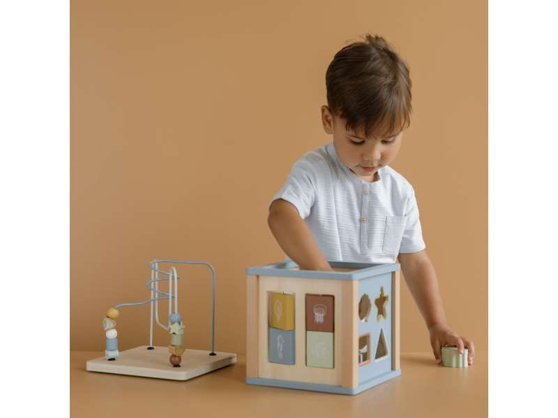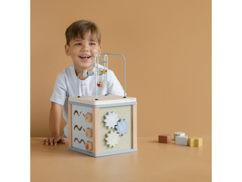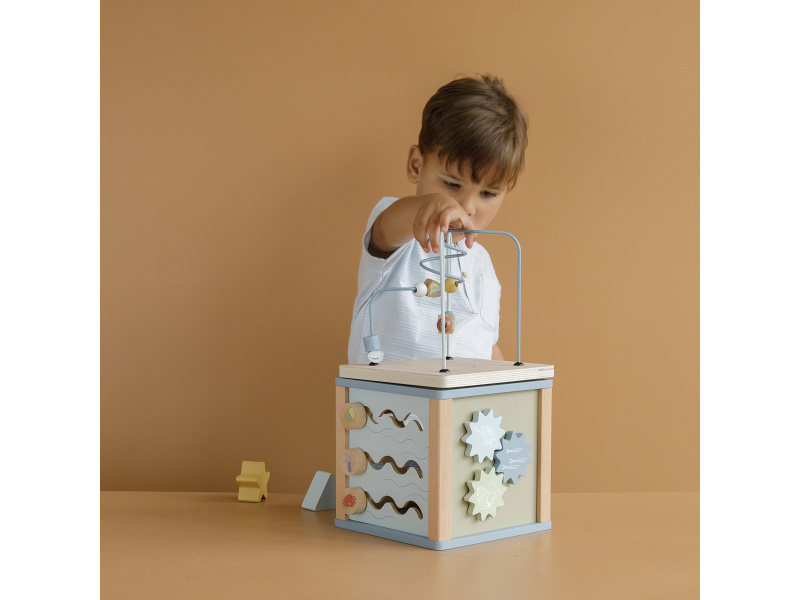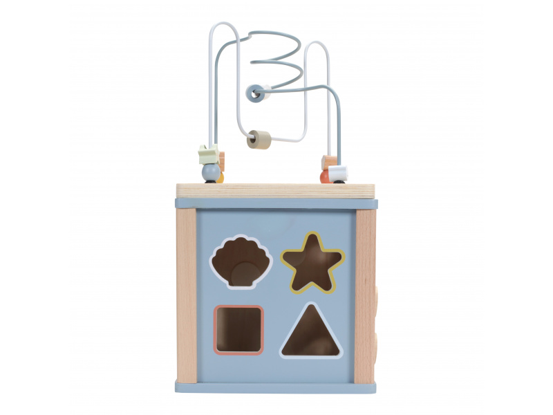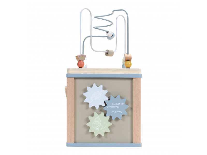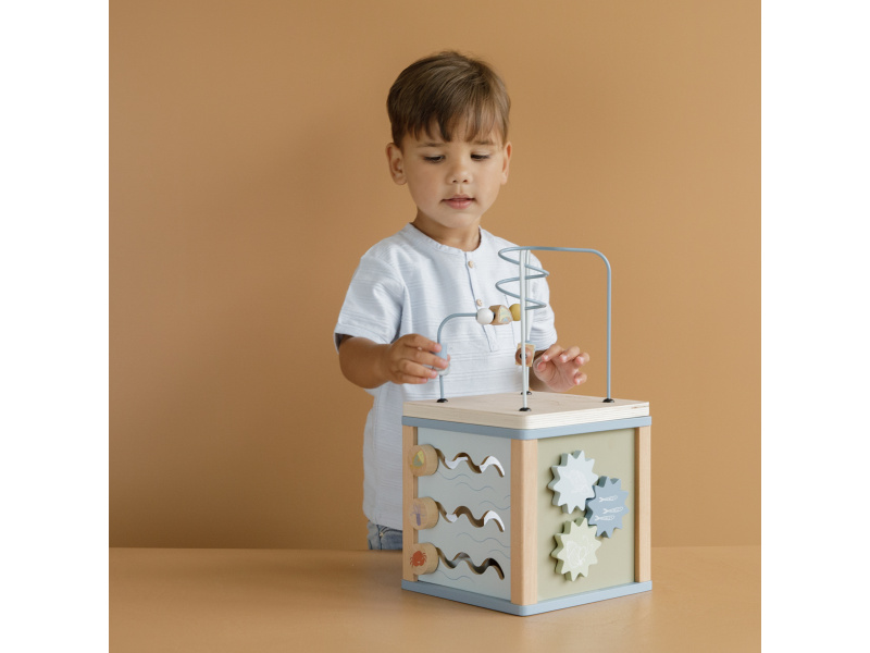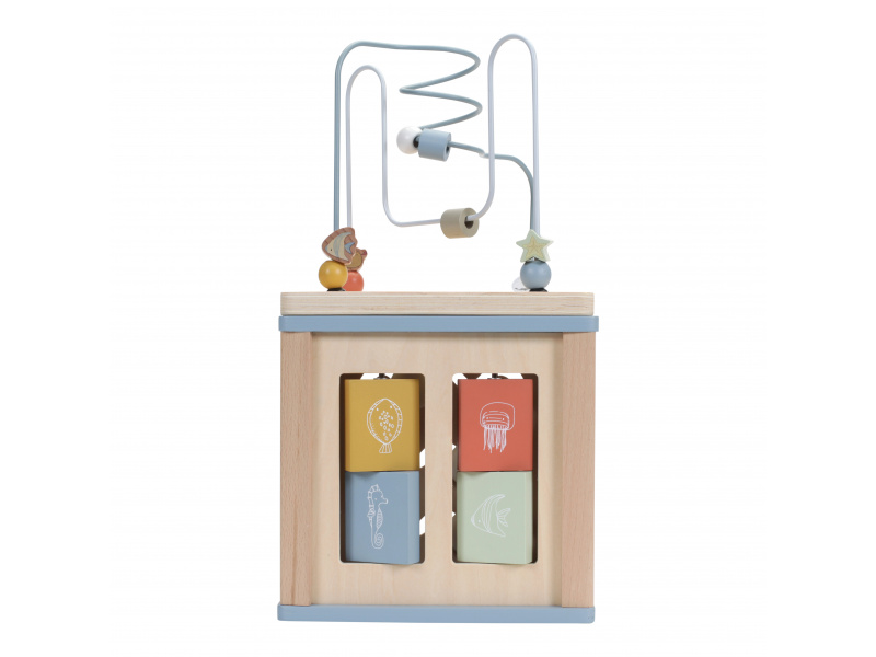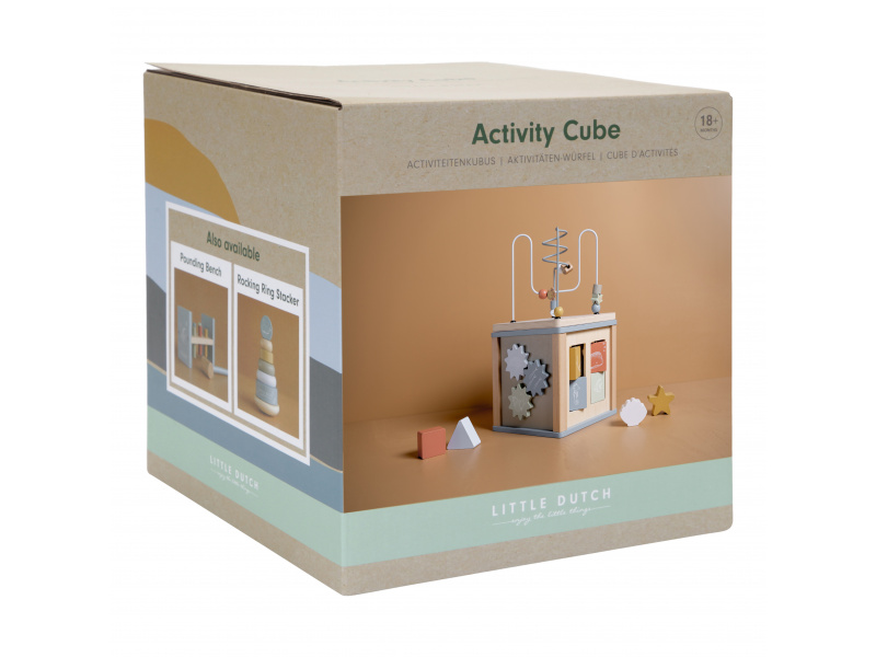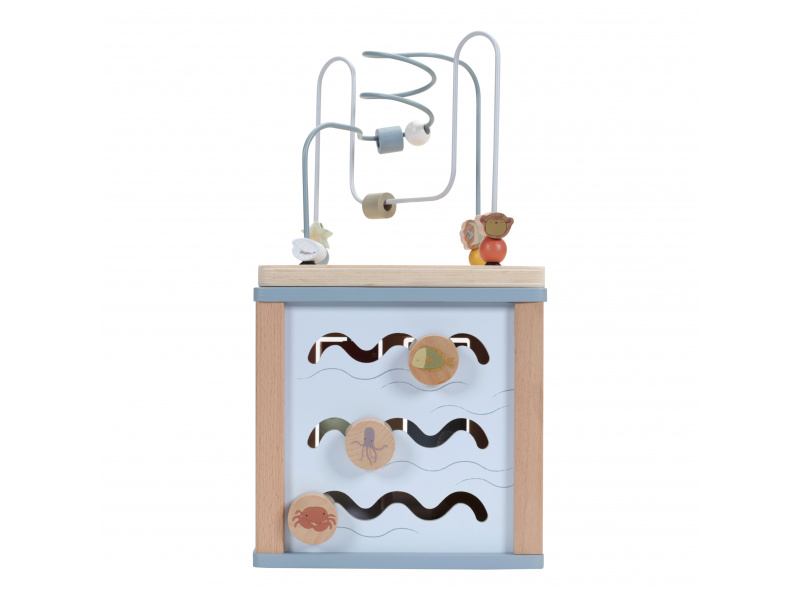 Krásná dřevěná kostka s aktivitami vzbuzuje u dětí zvědavost a poskytuje jim spoustu zábavy. Jednotlivé strany kostky obsahují nabízí různorodé aktivity - např. třídění tvarů, rotující převody, hádanky či spirály s posuvnými korálky. Hračka pomáhá rozvíjet jemnou motoriku i kreativitu dítěte. Hračka je součástí designové kolekce hraček a doplňků Little Dutch Ocean. Rozměry: 20 x 20 x 40 cm Vhodné pro děti od 18 měsíců.