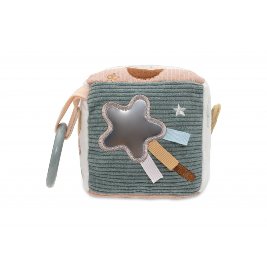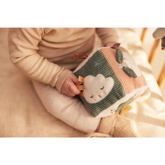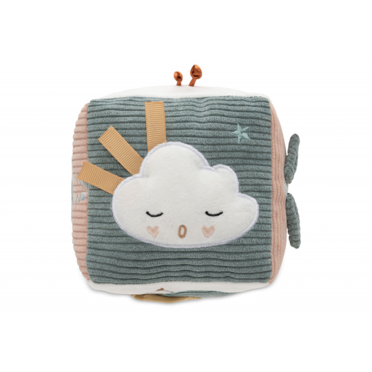 Měkká plyšová kostka s krásnými přírodními a pohádkovými motivy je díky svému provedení snadno uchopitelná malými dětskými ručičkami. Různorodé textury a vyšívané ilustrace lákají dítě ke zkoumání. Rozměry: 10 x 10 x 10 cm Složení: 100% polyester Možno prát v ruce. Vhodné pro děti od narození.