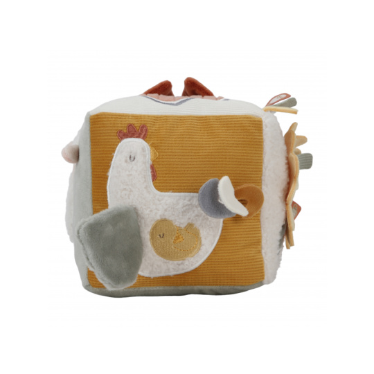 Měkká plyšová kostka je díky svému provedení snadno uchopitelná malými dětskými ručičkami. Různorodé textury, připevněné hračky a vyšívané ilustrace motivů ze života na farmě lákají dítě ke zkoumání, kostka navíc při pohybu jemně cinká. Hračka je součástí designové kolekce hraček Little Dutch Farma. Rozměry: 14 x 14 x 14 cm Složení: 100% polyester Vhodné pro děti od narození.