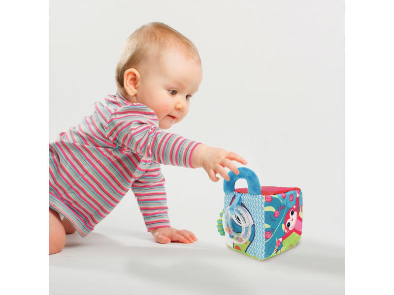 Měkká textilní kostka nabízí různorodé aktivity, které vaše dítě zabaví a zároveň pomáhají rozvíjet jeho jednotlivé smysly i motorické dovednosti dítěte. Pozornost dítěte upoutají výrazné ilustrace motivů z džungle, průhledné chrastítko s korálky, plyšová rukojeť i kousátko. Kousátko v podobě kroužku umožňuje kostku připevnit na kočárek či autosedačku. Rozměry: 10 x 15 x 10 cm Vhodné pro děti od 3 měsíců.